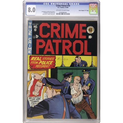 <B>Crime Patrol #10 Davis Crippen ("D" Copy) pedigree (EC, 1949) CGC VF 8.0 Off-white to white pages.</B></I> Johnny Craig supplied the cover art for this pre-Trend EC, and there's interior art by Al Feldstein, H. C. Kiefer, and even Johnny Thunder's artist, Stan Aschmeier! Overstreet 2006 VF 8.0 value = $369. CGC census 10/06: 1 in 8.0, 4 higher. <I>From the Crippen Collection.</B></I><BR><BR><b>Shipping:</b> Slabbed Comic (<a target="_blank" href="http://www.heritageauctions.com/common/shipping.php">view shipping information</a>)