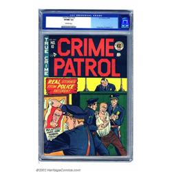Crime Patrol #10 (EC, 1949) CGC VF/NM 9.0 Off-white pages. Johnny Craig was the top crime artist for pre-Trend EC Comics, and you can certainly see why in this solidly-constructed cover. This copy is the best that CGC has graded and is quite reasonably priced compared to the horror books that would soon take over the title. Overstreet 2002 NM 9.4 value = $620. Important notice: We expect to be auctioning lots at the rate of 200-250 per hour. Sometimes eBay Premier live bid software cannot keep up with that pace, so we strongly recommend that you place a realistic proxy bid now as insurance to avoid disappointment. Also please note that all Heritage/CAA lots purchased through eBay Premier carry a 20% Buyer's Premium. Please make sure you read the Terms and Conditions.