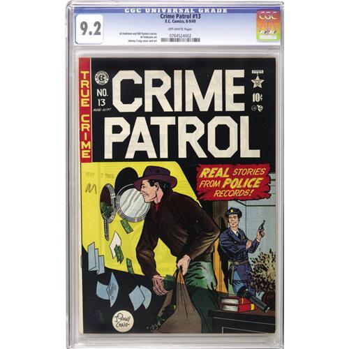<B>Crime Patrol #13 (EC, 1949) CGC NM- 9.2 Off-white pages.</B></I> This stunning copy sure looks like it came from the William Gaines stash, but surprise -- it didn't! There's only one nicer copy, according to the current CGC census, and this is by far the highest-graded copy we've ever offered. Johnny Craig did the cover while the curiously named "F. C. Aljon" (try putting Al Feldstein and Johnny Craig's names together and see what you get!) provided interior art. Overstreet 2006 NM- 9.2 value = $800. CGC census 10/06: 1 in 9.2, 1 higher.<BR><BR><b>Shipping:</b> Slabbed Comic (<a target="_blank" href="http://www.heritageauctions.com/common/shipping.php">view shipping information</a>)