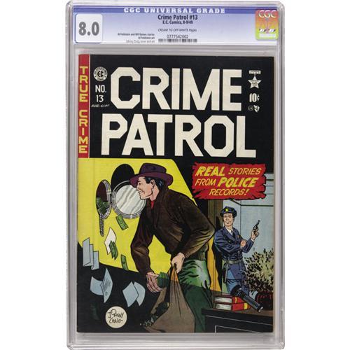 <B>Crime Patrol #13 (EC, 1949) CGC VF 8.0 Cream to off-white pages.</B></I> Johnny Craig cover. Art by "F. C. Aljon" (Johnny Craig and Al Feldstein). Overstreet 2006 VF 8.0 value = $369. CGC census 10/06: 1 in 8.0, 2 higher.<BR><BR><b>Shipping:</b> Slabbed Comic (<a target="_blank" href="http://www.heritageauctions.com/common/shipping.php">view shipping information</a>)