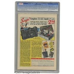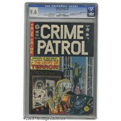 <B>Crime Patrol #15 Gaines File pedigree (EC, 1950) CGC NM+ 9.6 Off-white to white pages.</B></I> A very significant book in EC history, this issue (while technically a pre-Trend title) has the first stirrings of EC's New Trend. The historic tale is called "Return From The Grave!" and it features the first appearance of the Crypt Keeper and our first glimpse of the Crypt of Terror. Our nightmares would never be the same! That first horror story, an experiment on EC's part, was written and drawn by Al Feldstein; the book also has Johnny Craig art as well as a Craig cover. Note that while CGC has certified this book as a Gaines File copy, no certificate accompanies this lot. Overstreet 2004 NM- 9.2 value = $3,500. CGC census 1/05: 3 in 9.6, 1 higher.