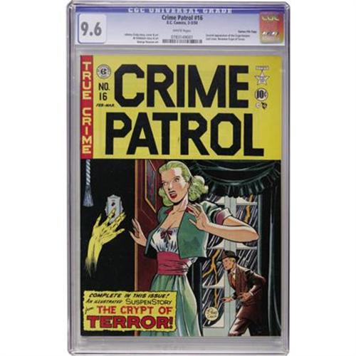 <B>Crime Patrol #16 Gaines File pedigree 7/11 (EC, 1950) CGC NM+ 9.6 White pages.</B></I> Gorgeous copy of the last issue of the precursor title to Crypt of Terror, which in turn became <B>Tales From the Crypt</B></I>. The second appearance of the Crypt-Keeper is featured. Johnny Craig and Al Feldstein both scripted stories and furnished interior art, and Craig was responsible for the cover. Overstreet 2007 NM- 9.2 value = $2,775. CGC census 6/07: 3 in 9.6, 2 higher.<BR><BR><b>Shipping:</b> Comics - Slabbed (certified) (<a target="_blank" href="http://www.heritageauctions.com/common/shipping.php">view shipping information</a>)