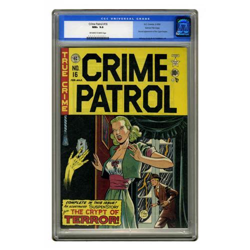 <B>Crime Patrol #16 Gaines File pedigree (EC, 1950) CGC NM+ 9.6 Off-white to white pages.</B></I> The Crypt Keeper makes his second appearance, spinning a yarn about a young couple who will inherit a large fortune, <I>on one condition</B></I>... guess what it is, readers! If you correctly said "he has to spend the night in a haunted house," you know your horror stories, and should bid on this comic immediately! Al Feldstein handled art chores on the story, and Johhny Craig and George Roussos also contributed to this issue, the last one before the name change to <B>Crypt of Terror</B></I>. Note that while CGC has certified this book as a Gaines File Copy, no certificate accompanies this lot. Overstreet 2005 NM- 9.2 value = $2,400. CGC census 12/05: 3 in 9.6, 1 higher.