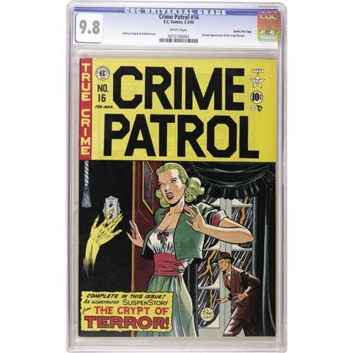 <B>Crime Patrol #16 Gaines File pedigree (EC, 1950) CGC NM/MT 9.8 White pages.</B></I> All right! Who just printed up this copy of a comic book from 1950? It's <I>vintage</B></I>? From the collection of William Gaines? Oh, my! The grade and page quality tell it all -- it's as perfect a copy as you'll find of this issue. The Crypt-Keeper makes his second appearance here, with Johnny Craig and Al Feldstein providing interior art. Craig did the cover. Note that while CGC has certified this comic as a Gaines File Copy, no certificate accompanies this lot. Overstreet 2006 NM- 9.2 value = $2,600. CGC census 12/06: 2 in 9.8, none higher.<BR><BR><b>Shipping:</b> Slabbed Comic (<a target="_blank" href="http://www.heritageauctions.com/common/shipping.php">view shipping information</a>)
