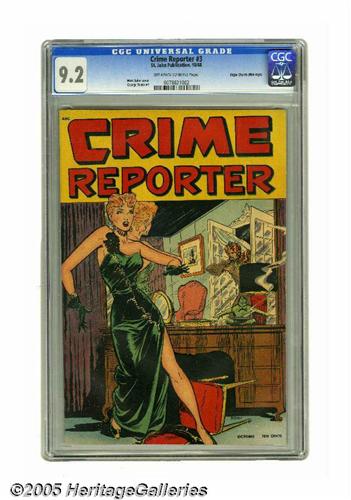 <B>Crime Reporter #3 Mile High pedigree (St. John, 1948) CGC NM- 9.2 Off-white to white pages.</B></I> This gem from the Mile High collection offers stunning "good girl" cover artwork by Matt Baker, with interior art by George Tuska. Seeing as how there are just four copies of this issue in the current CGC census, it seems this is not a common issue; bidders may be interested to note that the second-highest graded copy was certified at just FN 6.0. With only three issues in this title's run, you can pick up one-third of the series with this single issue! Overstreet 2005 NM- 9.2 value = $485. CGC census 4/05: 1 in 9.2, none higher.