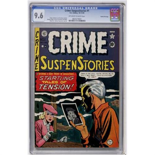 <B>Crime SuspenStories #1 Gaines File pedigree (EC, 1950) CGC NM+ 9.6 Off-white to white pages.</B></I> Sparkling copy of the first issue of this title, which features a Johnny Craig cover, and art by Craig, Wally Wood, Graham Ingels, and Harvey Kurtzman. CGC has certified this as a Gaines File copy, but a certificate does not accompany the book. Overstreet 2007 NM- 9.2 value = $1,800. CGC census 5/07: 1 in 9.6, 2 higher.<BR><BR><b>Shipping:</b> Comics - Slabbed (certified) (<a target="_blank" href="http://www.heritageauctions.com/common/shipping.php">view shipping information</a>)