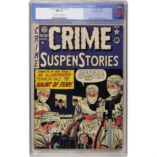 <B>Crime SuspenStories #10 Gaines File pedigree 9/12 (EC, 1952) CGC NM 9.4 Off-white to white pages.</B></I> According to CGC's current census, only one copy of the issue has been certified with a higher grade to date. Johnny Craig cover with interior art by Craig, Graham Ingels, Jack Kamen, and Jack Davis. Overstreet 2007 NM- 9.2 value = $570. CGC census 6/07: 2 in 9.4, 1 higher.<BR><BR><b>Shipping:</b> Comics - Slabbed (certified) (<a target="_blank" href="http://www.heritageauctions.com/common/shipping.php">view shipping information</a>)