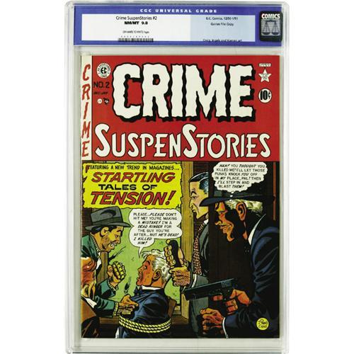 <B>Crime SuspenStories #2 Gaines File pedigree 3/11 (EC, 1950) CGC NM/MT 9.8 Off-white to white pages.</B></I> CGC's assigned grade pretty much says it all -- we can't imagine a nicer-looking book than this! Johnny Craig's cover is supported by interior art from himself (on two stories), Graham Ingels, and Jack Kamen. Overstreet 2005 NM- 9.2 value = $900. CGC census 03/06: 3 in 9.8, none higher.
