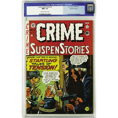 <B>Crime SuspenStories #2 Gaines File pedigree (EC, 1950) CGC NM+ 9.6 Off-white to white pages.</B></I> A mere three copies of this issue have been certified with higher grades by CGC as of this writing. The issue has a Johnny Craig cover, plus interior art by Craig (two stories), Graham Ingels, and Jack Kamen. Note that while CGC has certified this book as a Gaines File Copy, no certificate accompanies this lot. Overstreet 2006 NM- 9.2 value = $900. CGC census 5/06: 1 in 9.6, 3 higher. <BR><BR><B>Important notice:</B> Heritage usually auctions material at the rate of 200-250 lots per hour. On some occasions eBay Live bid software or the Internet may not be able to keep up with the pace of the auction. We recommend placing a realistic absentee bid now as insurance to avoid disappointment. Occasionally the auctioneer may eliminate or reject an eBay Live bid, and the auctioneer may also reopen a lot after the close of the eBay live bidding (usually because we missed an audience bid), and may reject your bid even if it shows you as the winning bidder. By bidding via eBay Live, you agree that Heritage may award the lot to another bidder at its sole discretion under the circumstances described above or any other reasonable circumstances. Since eBay bids are not shown to us until we open the lot on the floor, we treat those bids just like floor bids. In most cases the floor responds before the eBay bid is presented to us, due to Internet lag time, so for consistency we have made it a policy that floor bids are always considered first over tie eBay live bids. Also please note that all Heritage lots purchased through eBay Live carry a 22.5% Buyer's Premium. Please make sure you read the Terms and Conditions before you bid. This lot is being auctioned in conjunction with a live floor auction by Heritage Auction Galleries. All final auction and invoice information will be supplied by Heritage Auction Galleries, and all other information should be considered preliminary. Lot:41001 <BR><BR><B>Winning Notification and Billing:</B> After the FINAL session in this auction is complete, Heritage will send e-mail and snail mail invoices. This process normally takes several days. All final auction and invoice information will be supplied by Heritage Auction Galleries, and all other information should be considered preliminary. <BR><BR>This auction will be conducted on a live auction floor and over the Internet through eBay Live. If you choose to place an absentee bid, please take a moment to <font color='#0000ff'><u><a href='http://pages.ebay.com/liveauctions/help/before/laabsentee.html'>learn how eBay Live absentee bidding works</a></u></font><font color='#000000'>