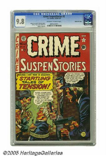 <B>Crime SuspenStories #2 Gaines File pedigree (EC, 1950) CGC NM/MT 9.8 Off-white to white pages.</B></I> In the story "Dead-Ringer," a criminal finds out that he looks exactly like a millionaire who has amnesia, giving him the idea to rub out the rich man and take his place. But his plan goes horribly wrong... Johnny Craig drew that story as well as the cover, which is in a similar vein. The book also has interior art by Graham Ingels and Jack Kamen. Note that while CGC has certified this book as a Gaines File copy, no certificate accompanies this lot. Overstreet 2005 NM- 9.2 value = $840. CGC census 2/05: 3 in 9.8, none higher.