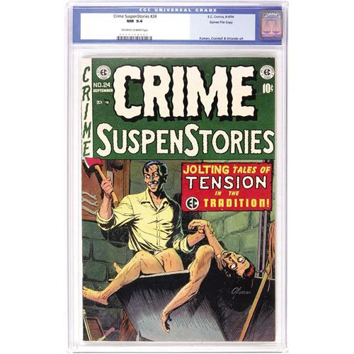 <B>Crime SuspenStories #24 Gaines File pedigree 2/12 (EC, 1954) CGC NM 9.4 Off-white to white pages.</B></I> This is the nicest copy of this issue we've seen in years. This cover art demonstrates that artist George Evans could match the efforts of his more famous colleagues - just axe anyone! And that cover scene leads into the story "Double-Crossed," which features an average Joe who finds he's the spitting image of a wealthy man who has a gorgeous wife. This being an EC comic, a plan to kill the big shot and switch places with him soon follows... and this being an EC comic, that plan is bound to backfire... Reed Crandall drew that story, and the issue also has the art of Jack Kamen, Joe Orlando, and Bernard Krigstein. Overstreet 2006 NM- 9.2 value = $250. CGC census 5/06: 1 in 9.4, 2 higher. <I>From the collection of Patrick Marchbanks.</B></I> <BR><BR><B>Important notice:</B> Heritage usually auctions material at the rate of 200-250 lots per hour. On some occasions eBay Live bid software or the Internet may not be able to keep up with the pace of the auction. We recommend placing a realistic absentee bid now as insurance to avoid disappointment. Occasionally the auctioneer may eliminate or reject an eBay Live bid, and the auctioneer may also reopen a lot after the close of the eBay live bidding (usually because we missed an audience bid), and may reject your bid even if it shows you as the winning bidder. By bidding via eBay Live, you agree that Heritage may award the lot to another bidder at its sole discretion under the circumstances described above or any other reasonable circumstances. Since eBay bids are not shown to us until we open the lot on the floor, we treat those bids just like floor bids. In most cases the floor responds before the eBay bid is presented to us, due to Internet lag time, so for consistency we have made it a policy that floor bids are always considered first over tie eBay live bids. Also please note that all Heritage lots purchased through eBay Live carry a 22.5% Buyer's Premium. Please make sure you read the Terms and Conditions before you bid. This lot is being auctioned in conjunction with a live floor auction by Heritage Auction Galleries. All final auction and invoice information will be supplied by Heritage Auction Galleries, and all other information should be considered preliminary. Lot:41001 <BR><BR><B>Winning Notification and Billing:</B> After the FINAL session in this auction is complete, Heritage will send e-mail and snail mail invoices. This process normally takes several days. All final auction and invoice information will be supplied by Heritage Auction Galleries, and all other information should be considered preliminary. <BR><BR>This auction will be conducted on a live auction floor and over the Internet through eBay Live. If you choose to place an absentee bid, please take a moment to <font color='#0000ff'><u><a href='http://pages.ebay.com/liveauctions/help/before/laabsentee.html'>learn how eBay Live absentee bidding works</a></u></font><font color='#000000'>