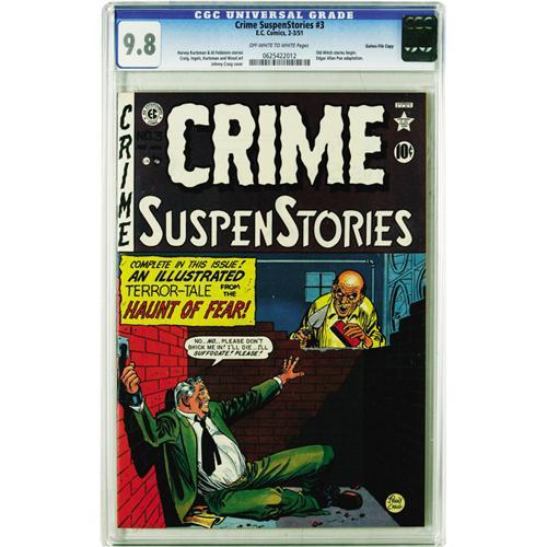 <B>Crime SuspenStories #3 Gaines File pedigree 8/11 (EC, 1951) CGC NM/MT 9.8 Off-white to white pages.</B></I> No copy has been certified with a higher grade by CGC to date - how could it? Significant also by the content - the Old Witch stories begin with this issue. The story "Blood Red Wine" adapts Edgar Allan Poe's "The Cask of Amontillado". And of course, the nonpareil EC art from Johnny Craig (who also did the cover), Graham Ingels, Harvey Kurtzman, and Wally Wood. Overstreet 2006 NM- 9.2 value = $625. CGC census 3/06: 4 in 9.8, none higher.