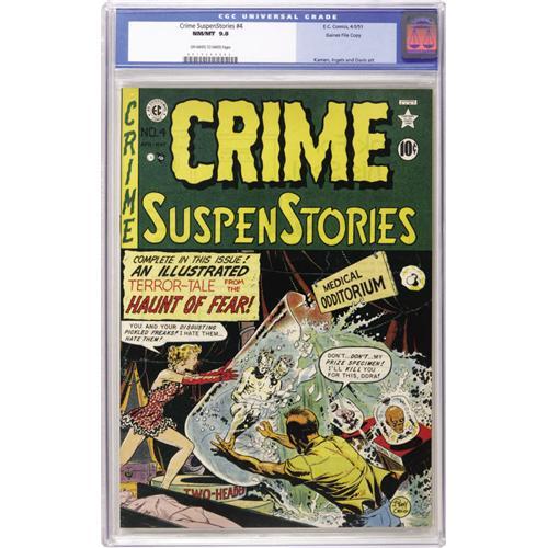 <B>Crime SuspenStories #4 Gaines File pedigree 2/11 (EC, 1951) CGC NM/MT 9.8 Off-white to white pages.</B></I> Something tells us that the sexy lady in the ultra-short dress will pay dearly for her outburst on the Johnny Craig cover. Craig also drew an interior story, as did Jack Kamen, Jack Davis, and Graham Ingels. And how about the CGC highest-grade-yet copy! Overstreet 2006 NM- 9.2 value = $625. CGC census 10/06: 2 in 9.8, none higher.<BR><BR><b>Shipping:</b> Slabbed Comic (<a target="_blank" href="http://www.heritageauctions.com/common/shipping.php">view shipping information</a>)