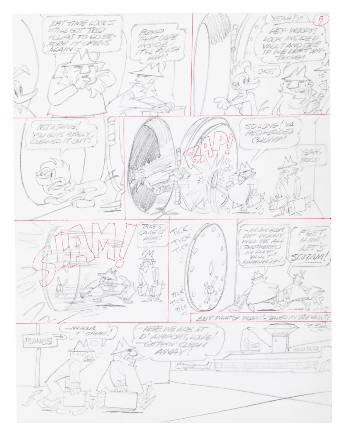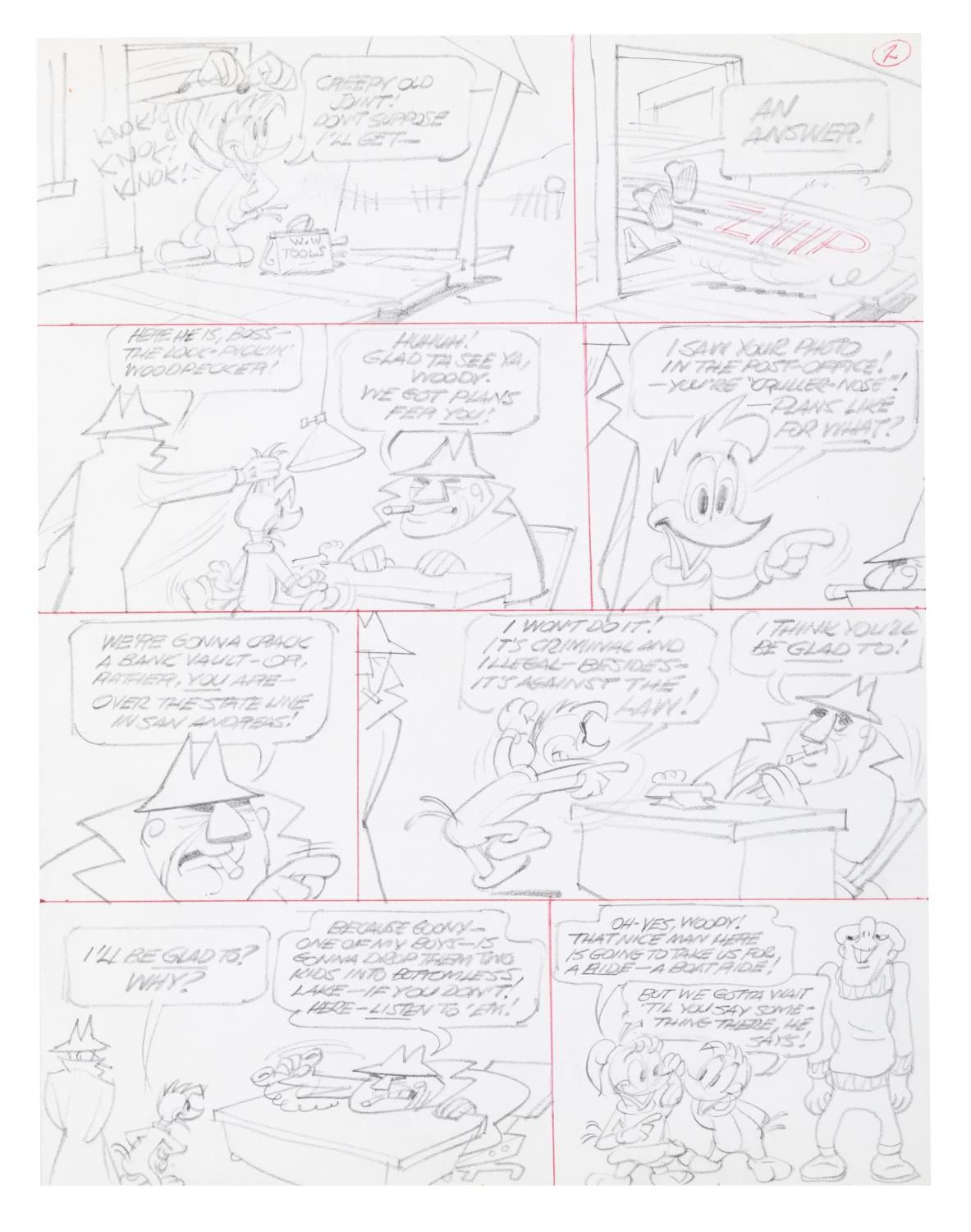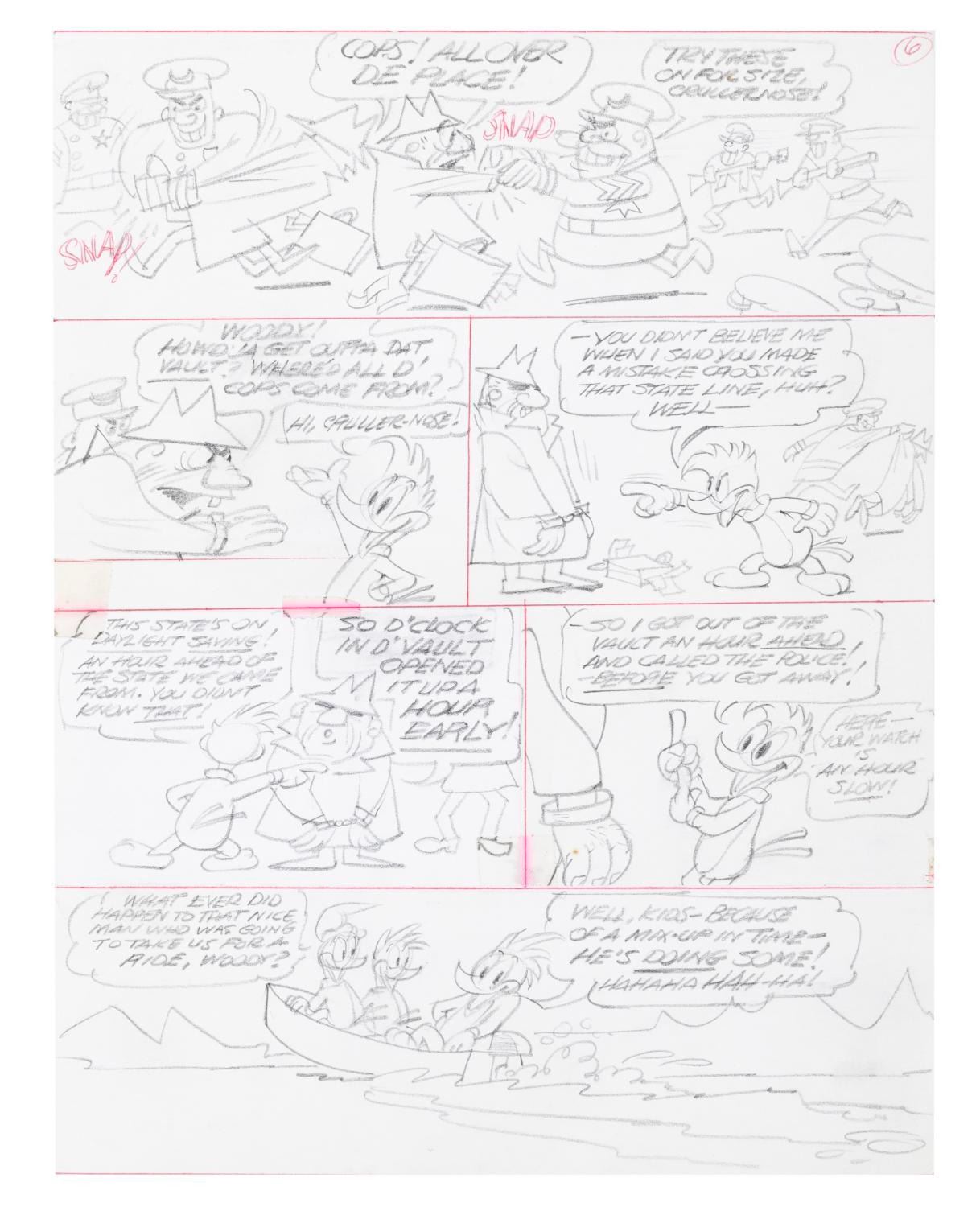 (Carmichael, 1940s-50s) A five-page set of original art by Jim Carmichael for the Woody Woodpecker comic “Crime on My Hands.” Measuring 8.5” x 11”, the graphite and red ink pages are in very good condition with light stains and wear.