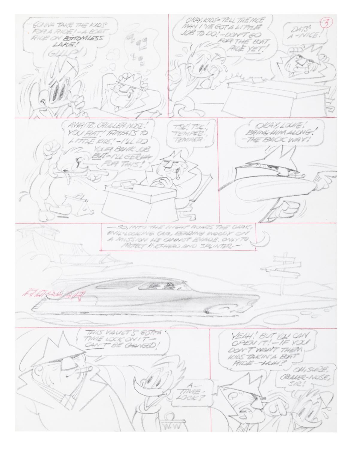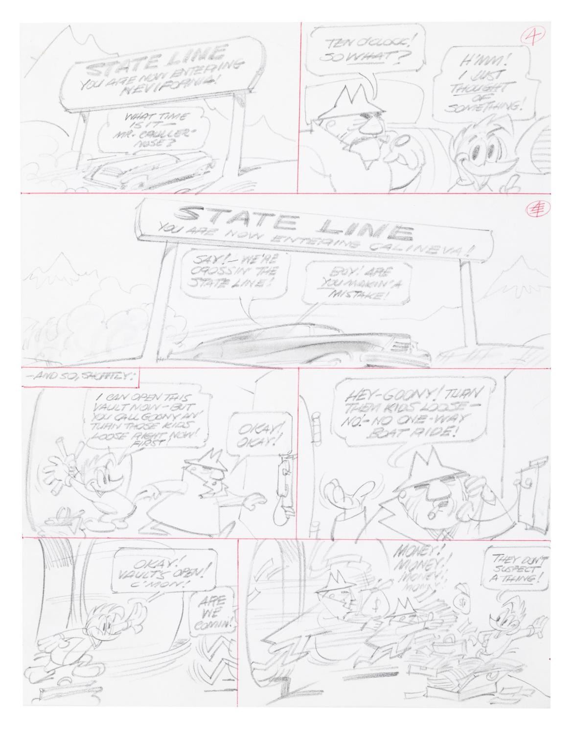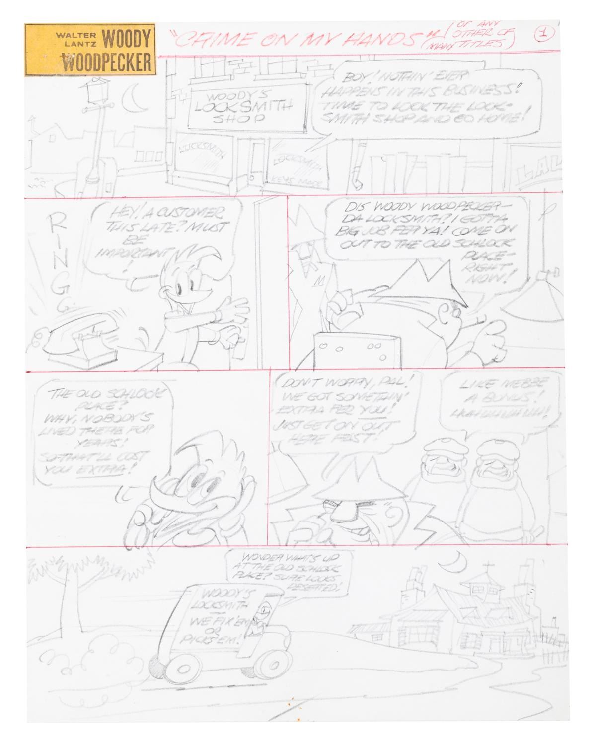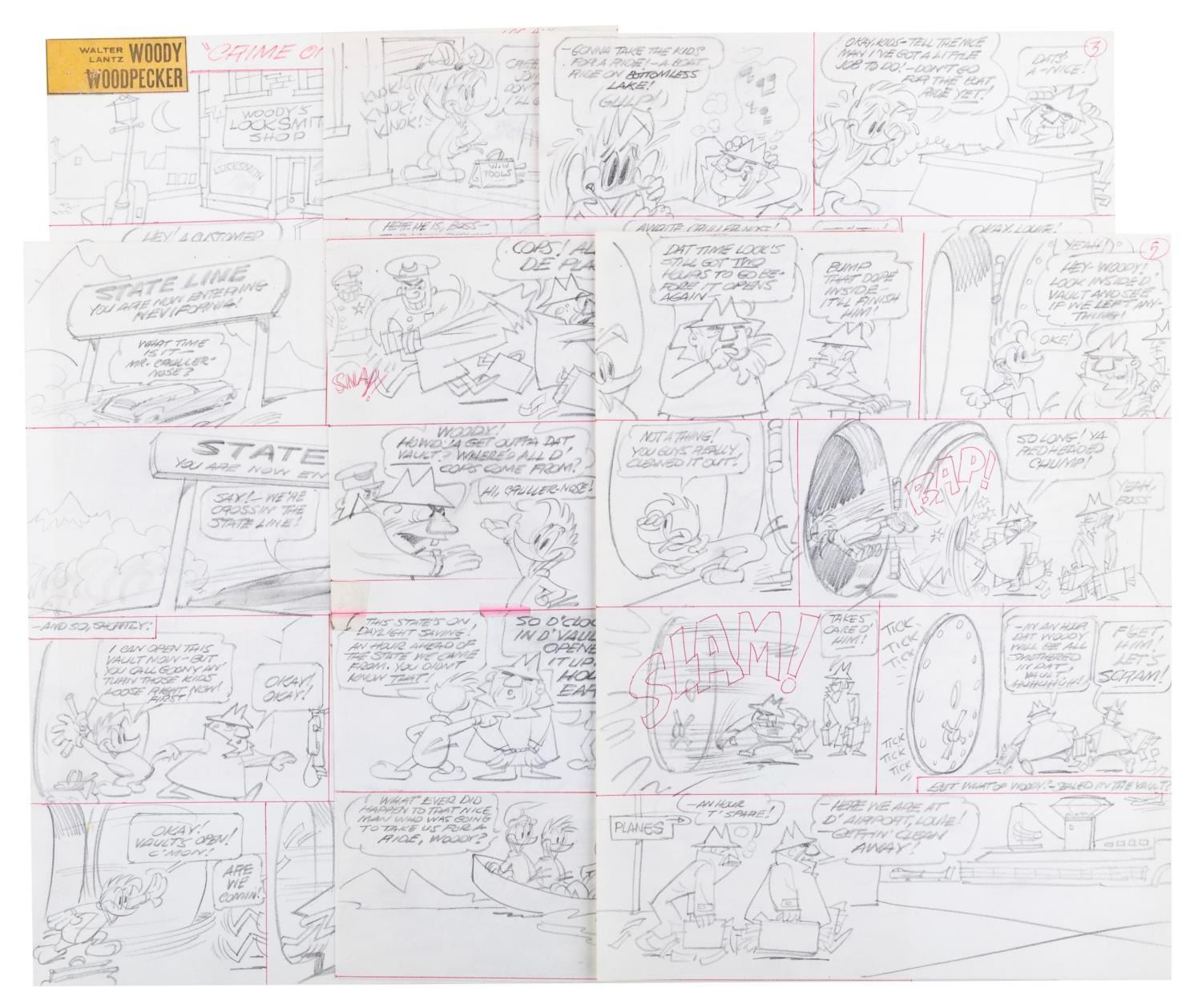 (Carmichael, 1940s-50s) A five-page set of original art by Jim Carmichael for the Woody Woodpecker comic “Crime on My Hands.” Measuring 8.5” x 11”, the graphite and red ink pages are in very good condition with light stains and wear.