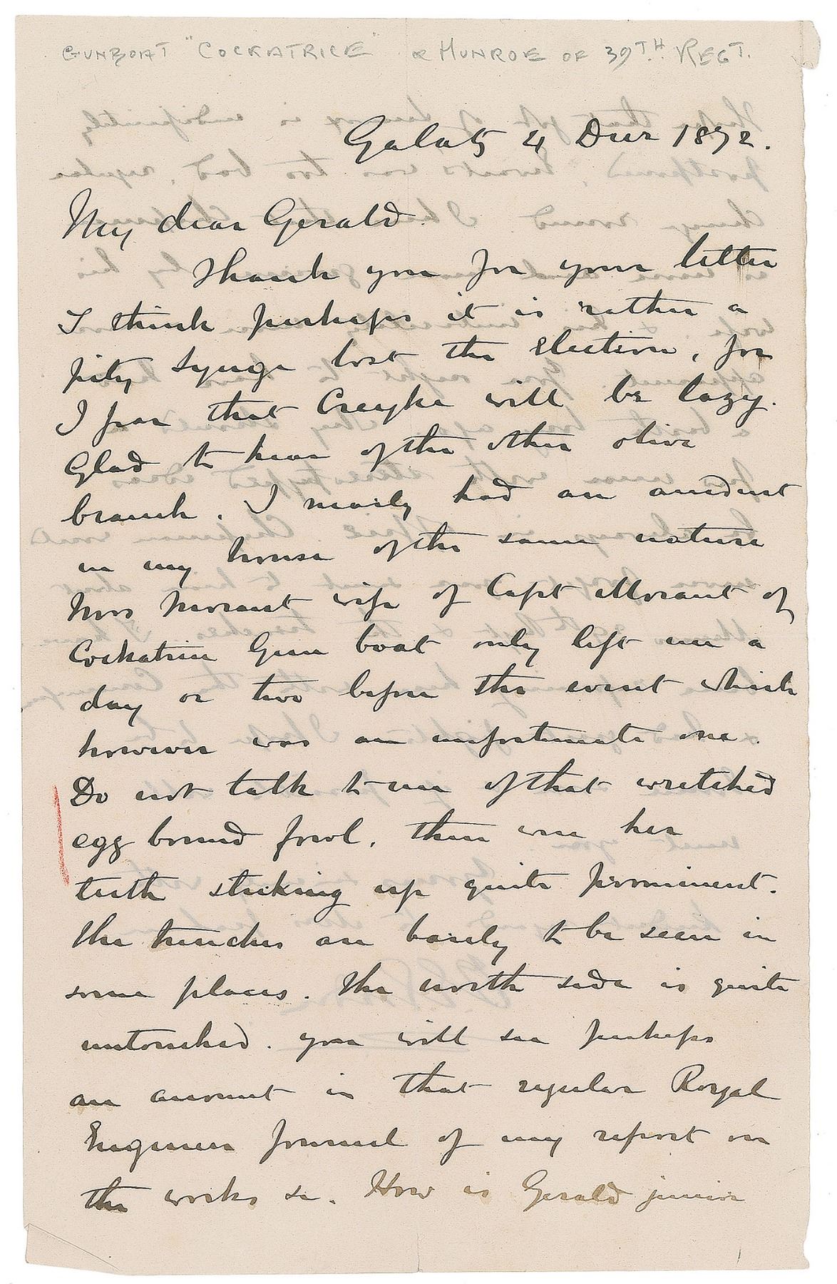 ALS signed “O. E. Snow,” one page both sides, 5.5 x 8.75, December 4, 1872. Letter to Gerald, in part: "Thank you for your letter I think perhaps it is rather a pity Synge lost the election, for I fear that Creyke will be lazy. Glad to hear of the other olive branch. I nearly had an accident in my house of the same nature Mrs. Morant wife of Capt. Morant of Cockatrice Gun boat only left me a day or two before the event which however was an unfortunate one. Do not talk to me of that wretched egg bound fowl, then her teeth sticking up quite prominent, the trenches are barely to be seen in some places. The north side is quite untouched. You will see perhaps an amount in that regular Royal Engineer Journal of my report in the works, etc…I hope that job…is indefinitely postponed…I hear that Chapman is more and more grieved by his wife & his imbecility more & more apparent. You ought to have had a berth long ago. They should a few even with stereotyped ideas be always in office." Snow’s correspondent is likely Lieutenant General Gerald Graham, who served in India, Gibraltar, Ireland, Canada, and in the “trenches” of Crimea. In fine condition.