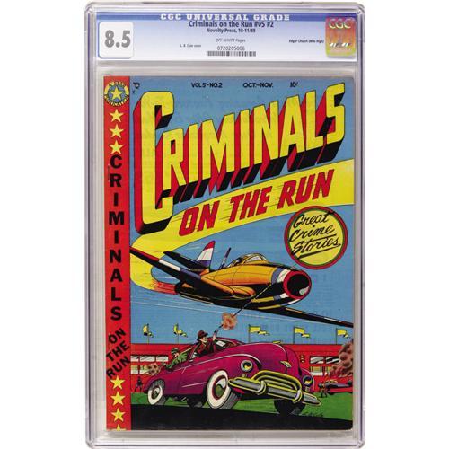 <B>Criminals on the Run V5#2 Mile High pedigree (Curtis, 1949) CGC VF+ 8.5 Off-white pages.</B></I> L. B. Cole provides an exciting and colorful cover to this issue, showing a speeding purple sedan shooting it out with... an airplane! Only in the comics, folks! This Edgar Church Mile High copy displays great cover gloss. Overstreet 2006 VF 8.0 value = $141; VF/NM 9.0 value = $208. CGC census 3/07: 1 in 8.5, none higher.<BR><BR><b>Shipping:</b> Comics - Slabbed (certified) (<a target=""_blank"" href=""http://www.heritageauctions.com/common/shipping.php"">view shipping information</a>)