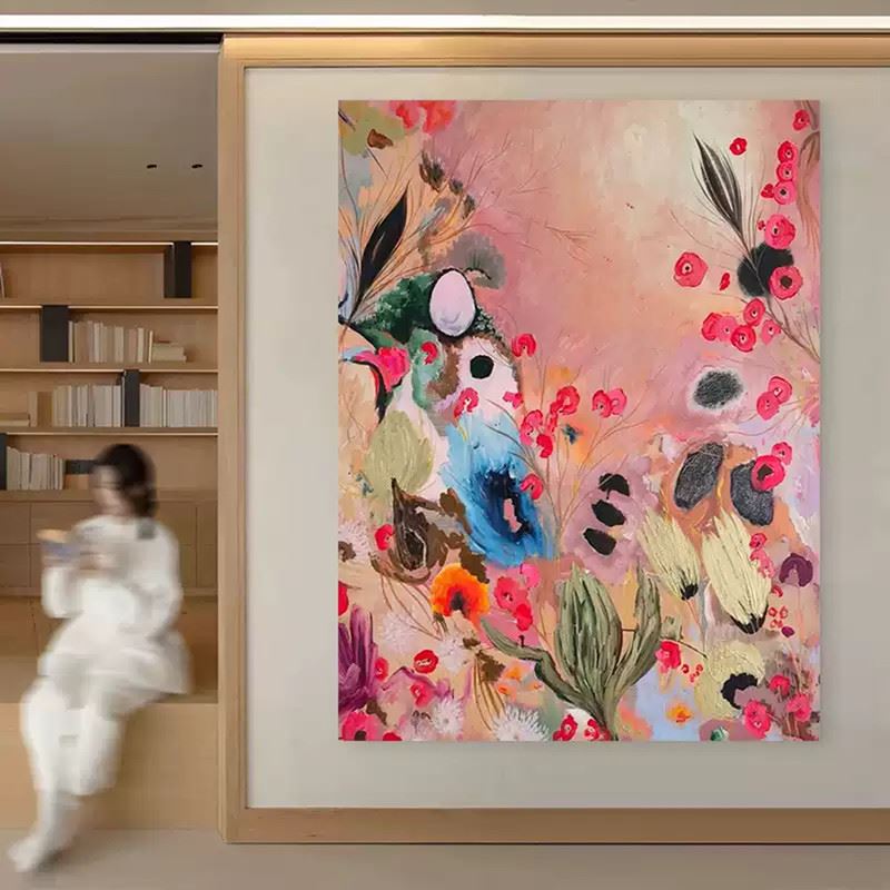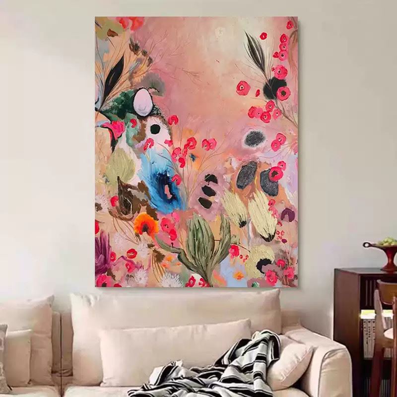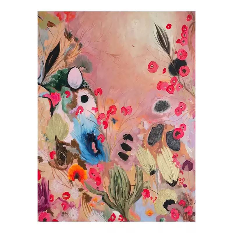 Tiny crimson flowers drift across a soft pink ground, like a dream stirred by a gentle breeze, slowly gathering around the scene. Dimensions: 24 x 31 inches.