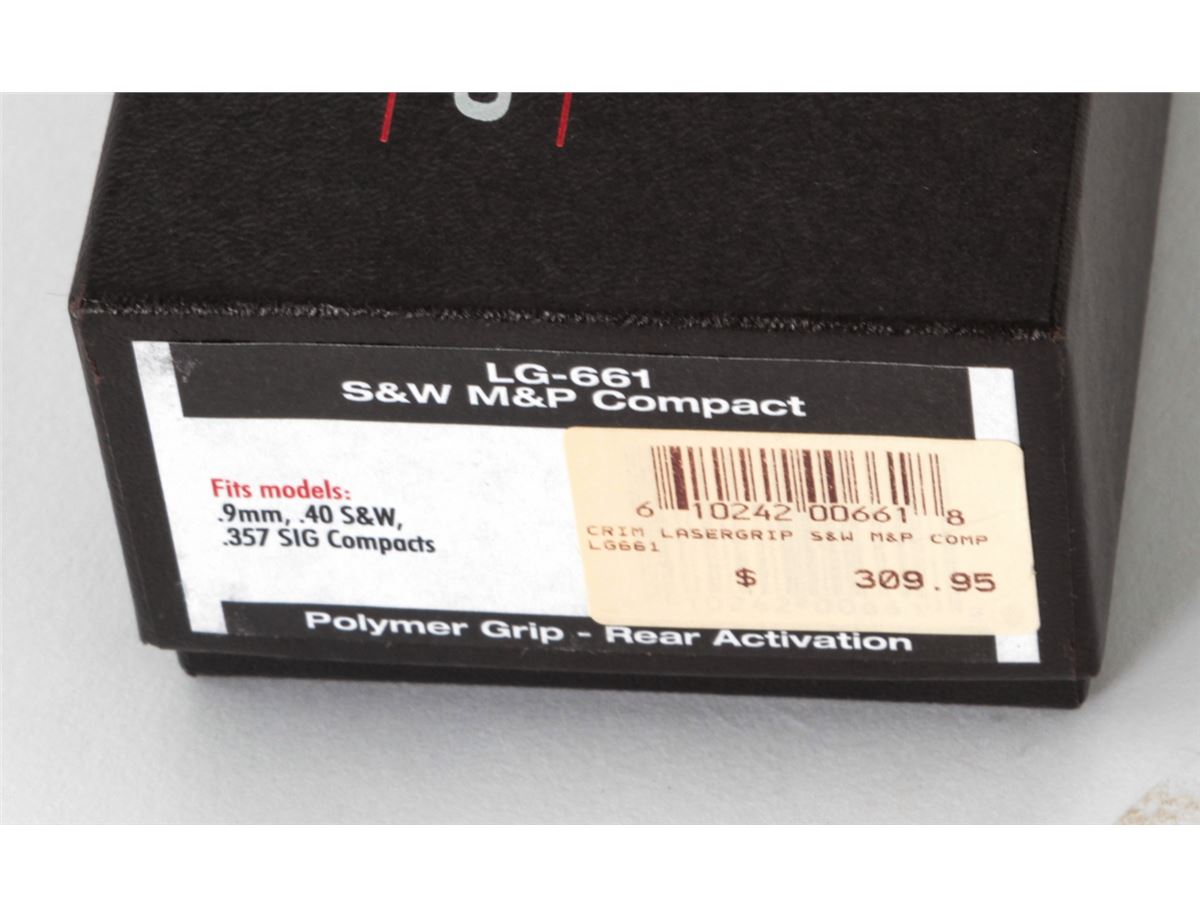 Crimson Trace Laser Grips, fits S&W M&P Compacts, 9mm, .40 S&W, and .357 SIG compacts. Brand new in original box with tools and instructions. Retails @ $309.95. Est.: $150-$250. (Field Time)