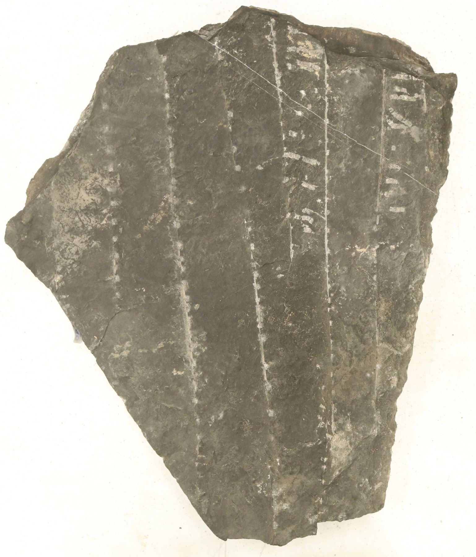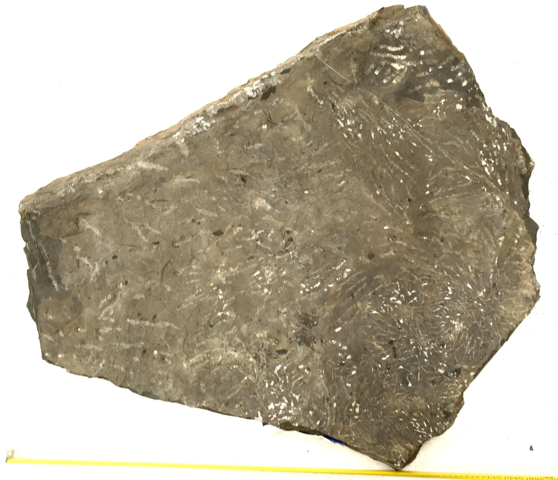 A fossil plate of crinoids, known as 'sea lilies'. These ancient organisms had a large 'flower' on a long, segmented stem, and were in the same family as modern starfish, sea urchins, and sand dollars. Not the best specimen; the crinoid 'flowers' are broken up. These fossils are 250-450 million years old and originate from China. 23" x 22", 2" thick.