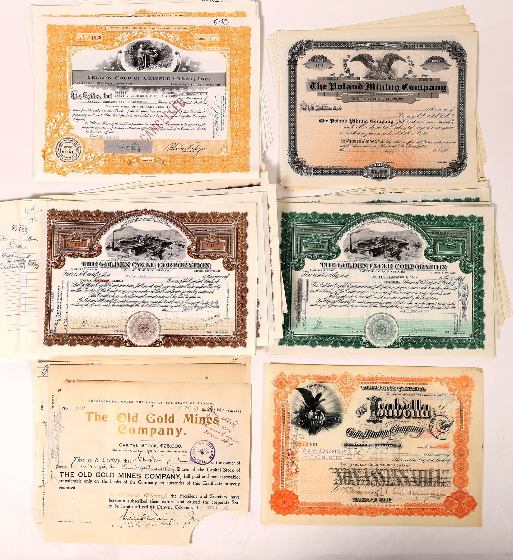 Lot of 46. Five different mining company. Includes Percy Hagerman autograph. 1) Isabella GMC. Issued in 1897, punch cancelled. Signed by Percy Hagerman as VP. Percy Hagerman was a businessman, outdoorsman, and well-known mountaineer who painted the mountains he was climbing. Hagerman Peak near Aspen is named for him. He inherited properties from his father, James J Hagerman, who owned and sold the Colorado Midland Railway Company and was an investor in the gold mines of Cripple Creek. 2) The Old Gold Mines Co. 5 stocks, 1902-03. President signature torn off. 3) Golden Cycle Corporation. 20 stocks, two varieties. Issued in the 1930s. Vignette of cyanide plant. 4) Yellow Gold of Cripple Creek, Inc. 10 stocks issued in 1980. Drilling vignette. 5) Poland Mining Company. 10 unissued stocks, 1890s.