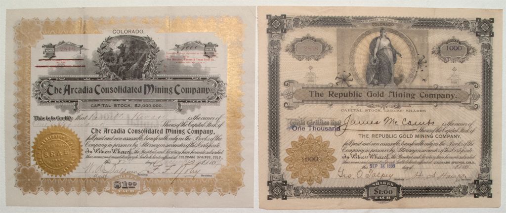 Lot of 2. 1) Arcadia Consolidated Mining Company. Incorporated in Colorado in 1896. Cert. #2816 issued to Romiette Howard for 1000 shares. Signed by F.F. Roby, president, and W.A. Baldwin, asst. secretary. Datelined Colorado Springs. Gilt border and seal. Printer not noted. This company was owned and controlled by W.S. Stratton. The property was located on Gold Hill on the east edge of the town of Cripple Creek [Hills, pp. 63, 442-443]. VF. 2) Republic Gold Mining Company. Incorporated in Colorado in 1896. Cert. #2858 issued to James McCombs for 1000 shares. Signed by H. S. Hawks, vice president, and Geo. O. Talpey, secretary. U/C. Printer not noted. Datelined Colorado Springs. VF. Mining History in American #10116. City: Cripple CreekCounty: TellerState: CO