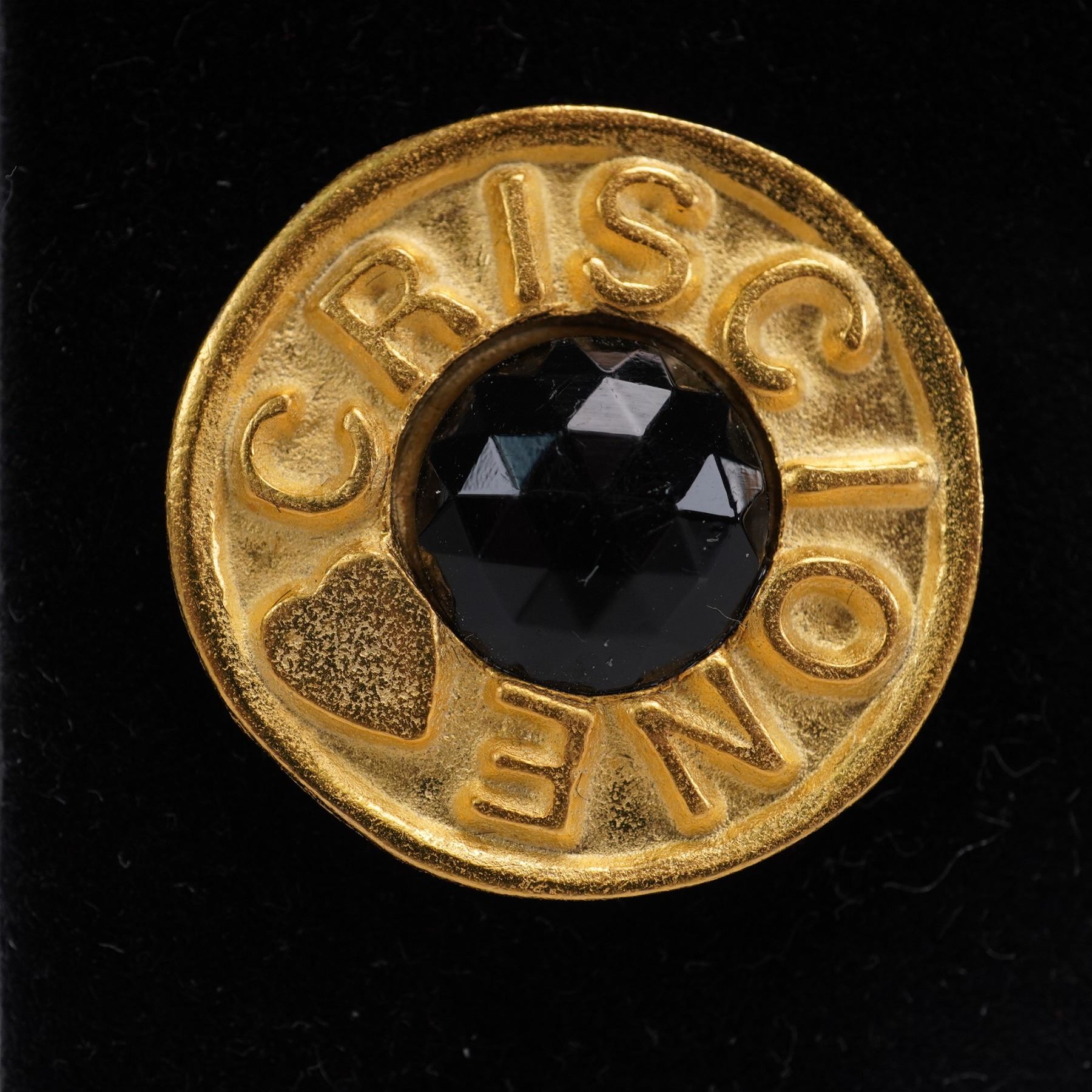 Commanding attention with bold design and timeless glamor, this striking pair of vintage CrisCione clip-on earrings captures the opulence of 1980s fashion. Featuring radiant gilt-metal roundels inscribed with the designer's name and a textured heart motif, each earring centers a dramatic faceted black crystal that sparkles with refined edge. The classic clip-back style and substantial presence make these statement earrings a must-have for collectors and lovers of vintage couture jewelry. Preserved with original display card, these earrings are a rare testament to CrisCione's short-lived but impactful career in the fashion world.