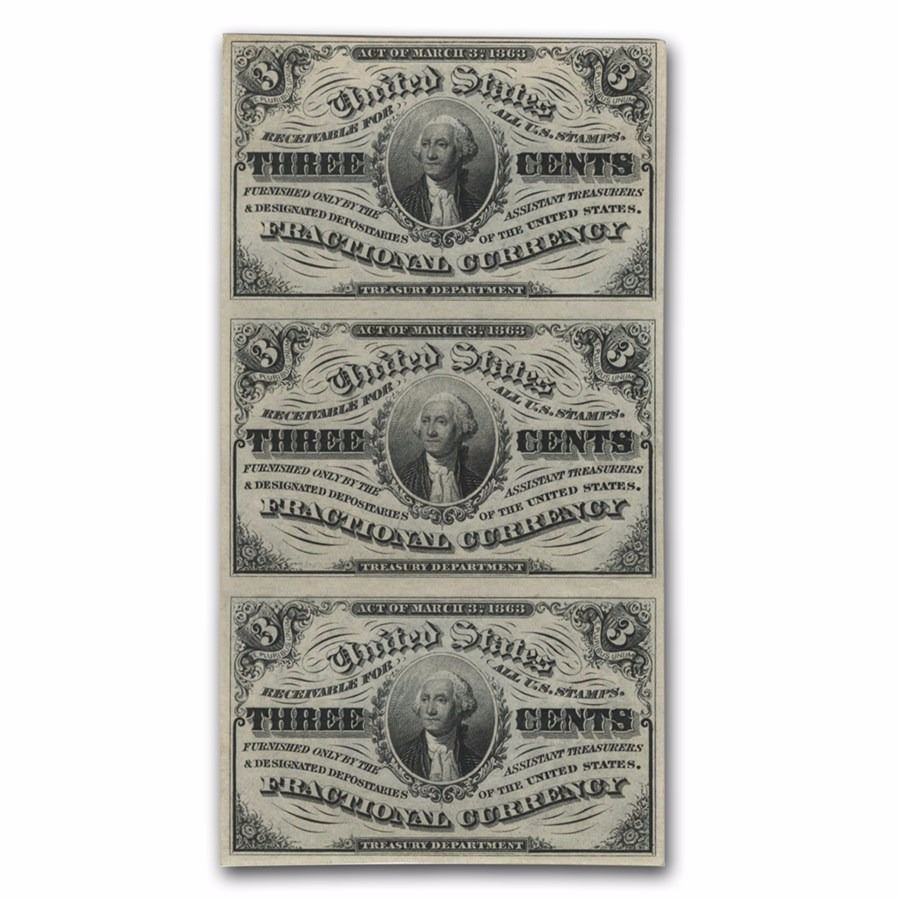 Crisp Uncirculated. Sheet 3 Notes 1863 3rd Issue Fractional Currency 3 Cents CU (FR#1226)