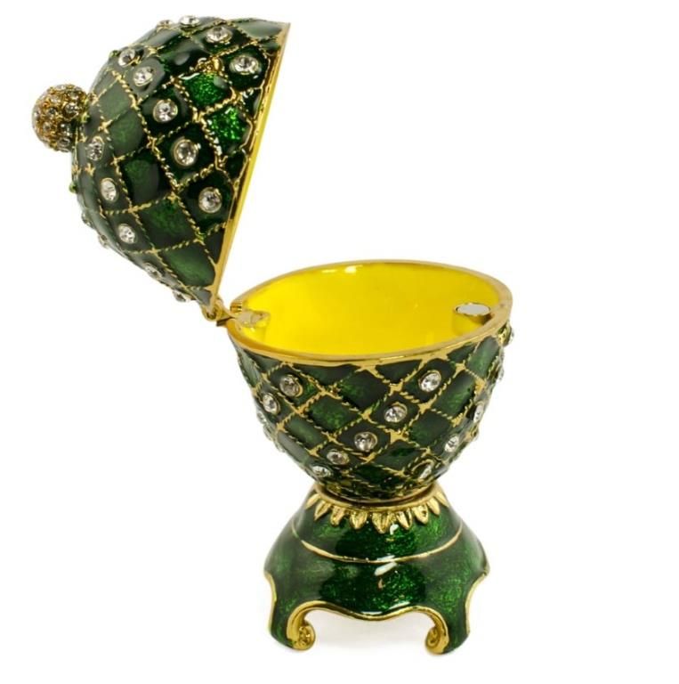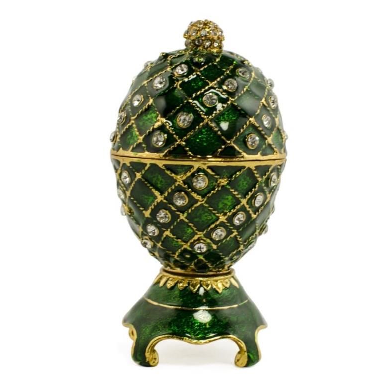 Cristal Vert Faberge Inspired Egg, This sparkling Faberge-inspired egg trinket box is adorned with clear crystals and high-polished enamel with golden trim. It opens on a hinge and has a magnetic closure to keep the box securely shut. . Height:3.1'' Width: 2" Pewter, Crystals, Enamel