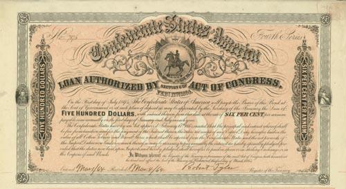 March 1864. A $500 Fourth Series bond bearing 6% interest. Black/Orange on white paper. Equestrian vignette of Washington at upper center. One row of coupons at bottom.