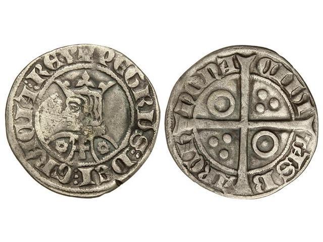 Croat. PERE III. BARCELONA. Anv.: ¶PETRVS:DEI:GRACIA:REX. Busto a izquierda, vestido partido flor-cruz-flor (6 puntas). Rev.: CIVI-TASB-ARCh´-NONA. Anillos en 1er y 4º espacios. Ba-289; Cru.VS-412. MBC-.