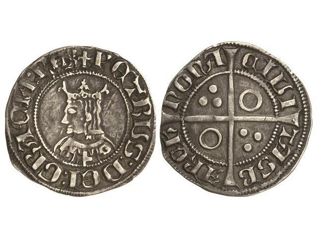 Croat. PERE III. BARCELONA. Anv.: PETRVS:DEI:GRACIA:REX. Busto a izquierda, vestido partido flor-curz-flor (6 puntas). Rev.: CIUI-TASB-ARCK-NONA. Anillos en 1er y 4º espacios. Pátina oscura. Ba-283. MBC/MBC+.