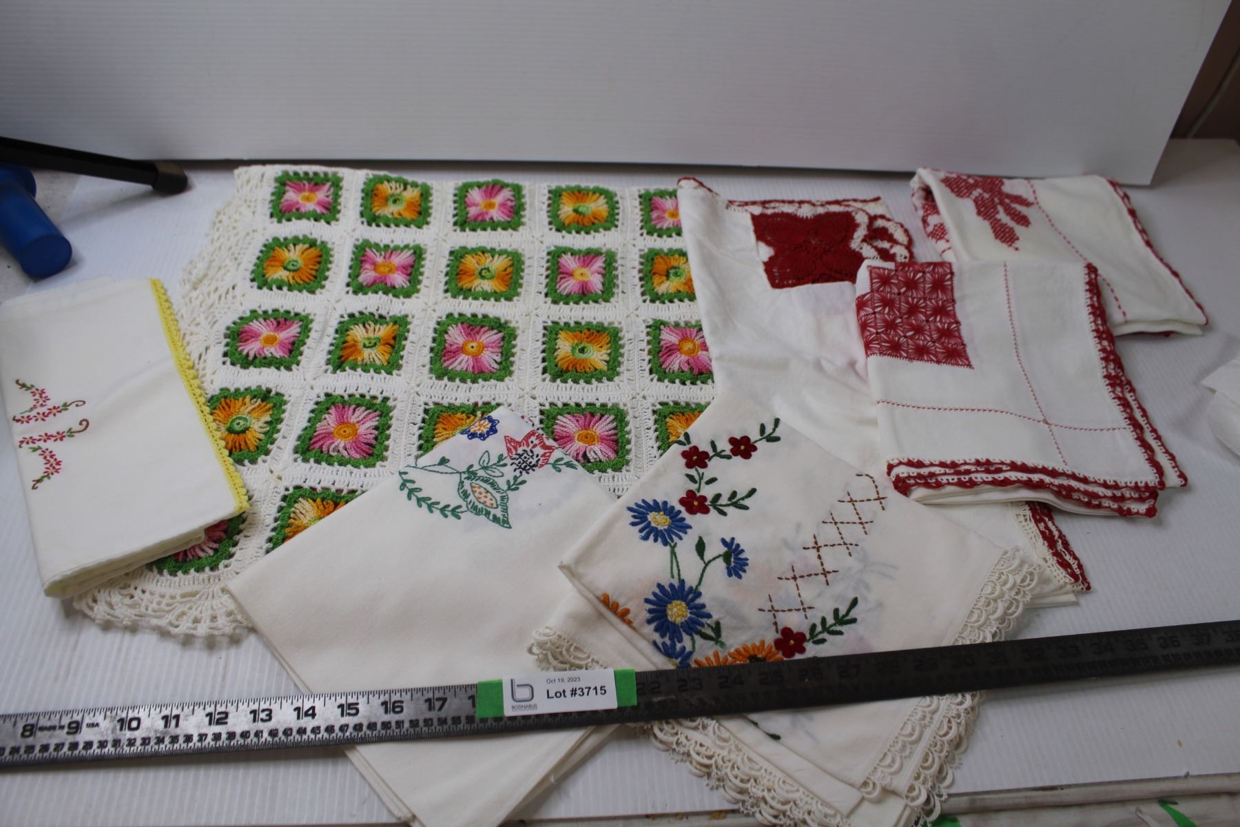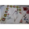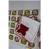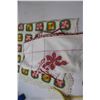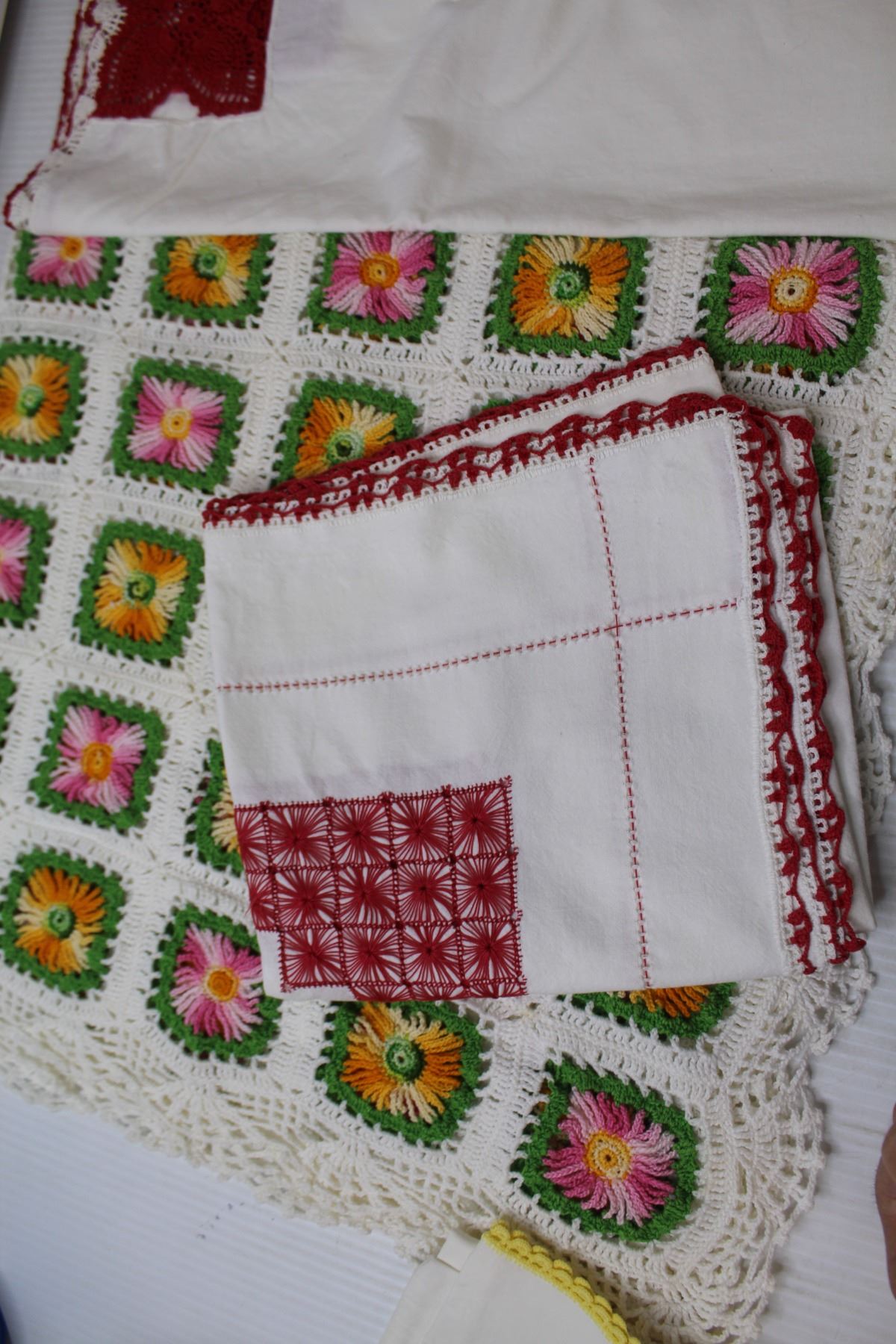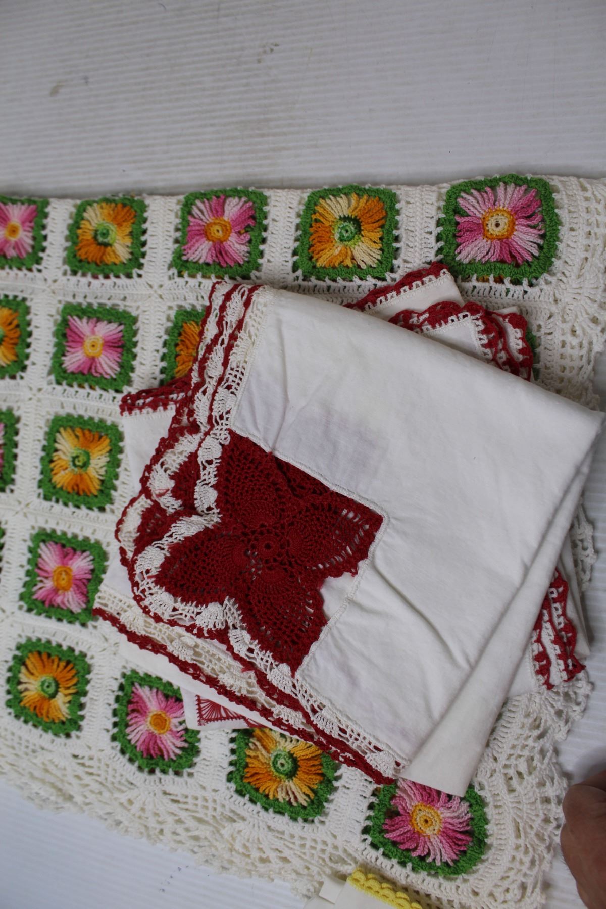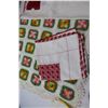 Crochet Table Cloth (app 36x36"), (3) Red (app40x40) stitched Table clothes Red/White), (2) multi-colour stitched ,(1) pillow case 11*18")