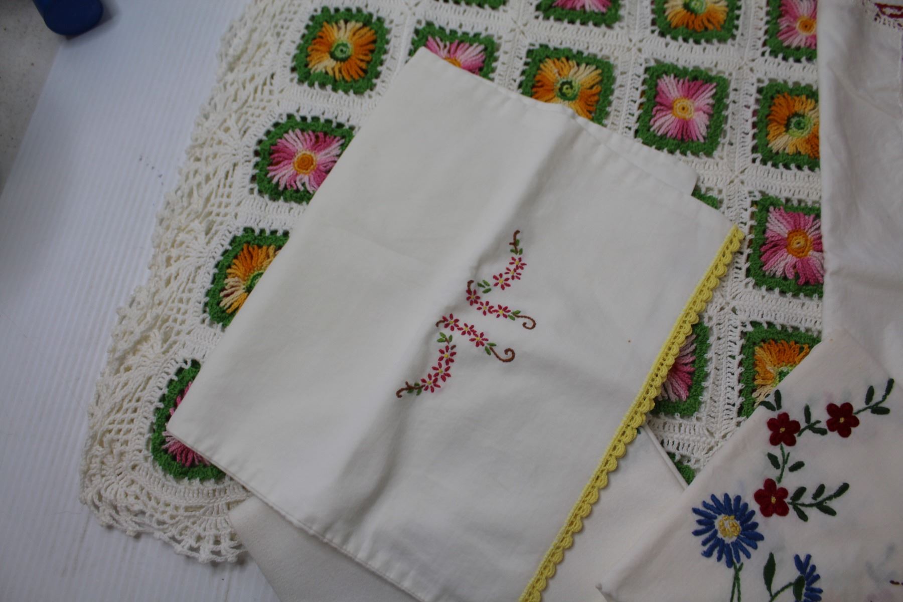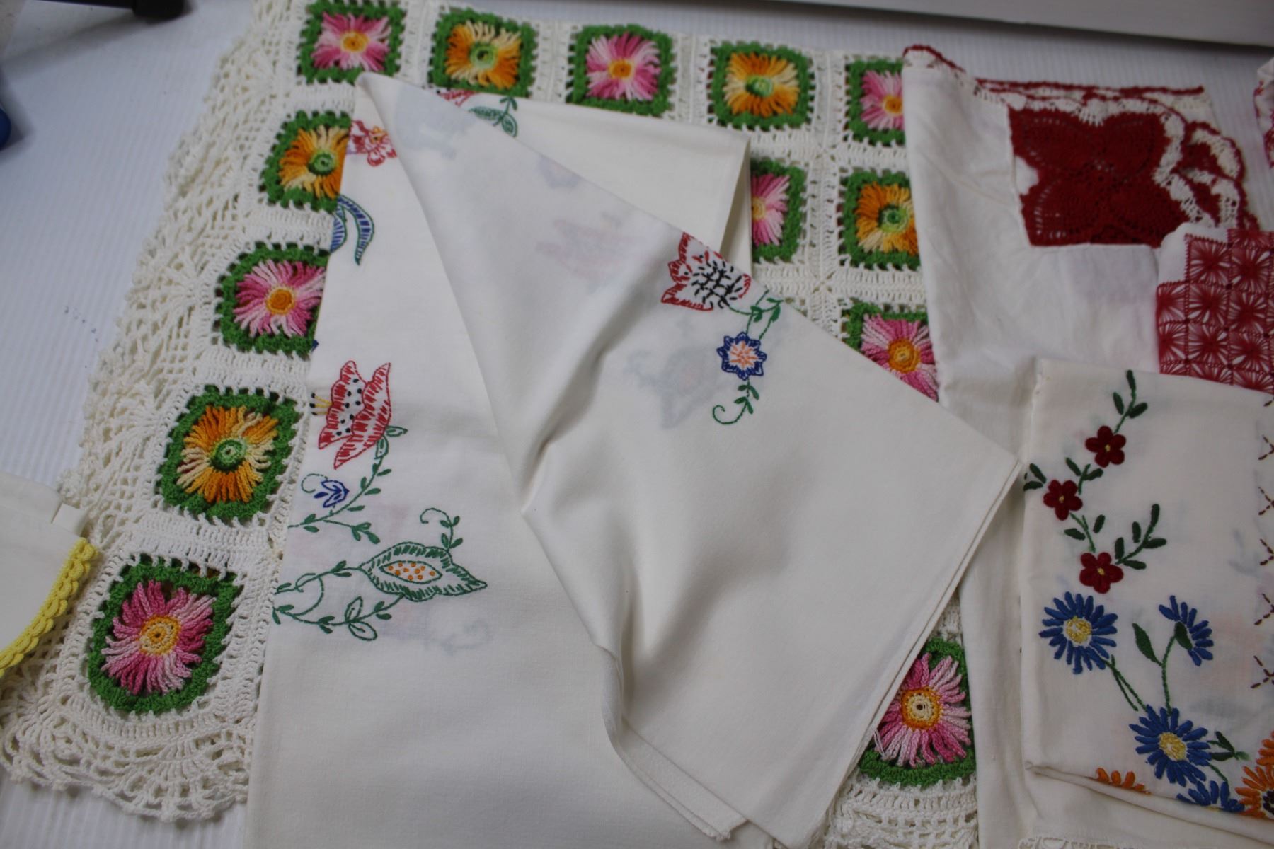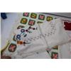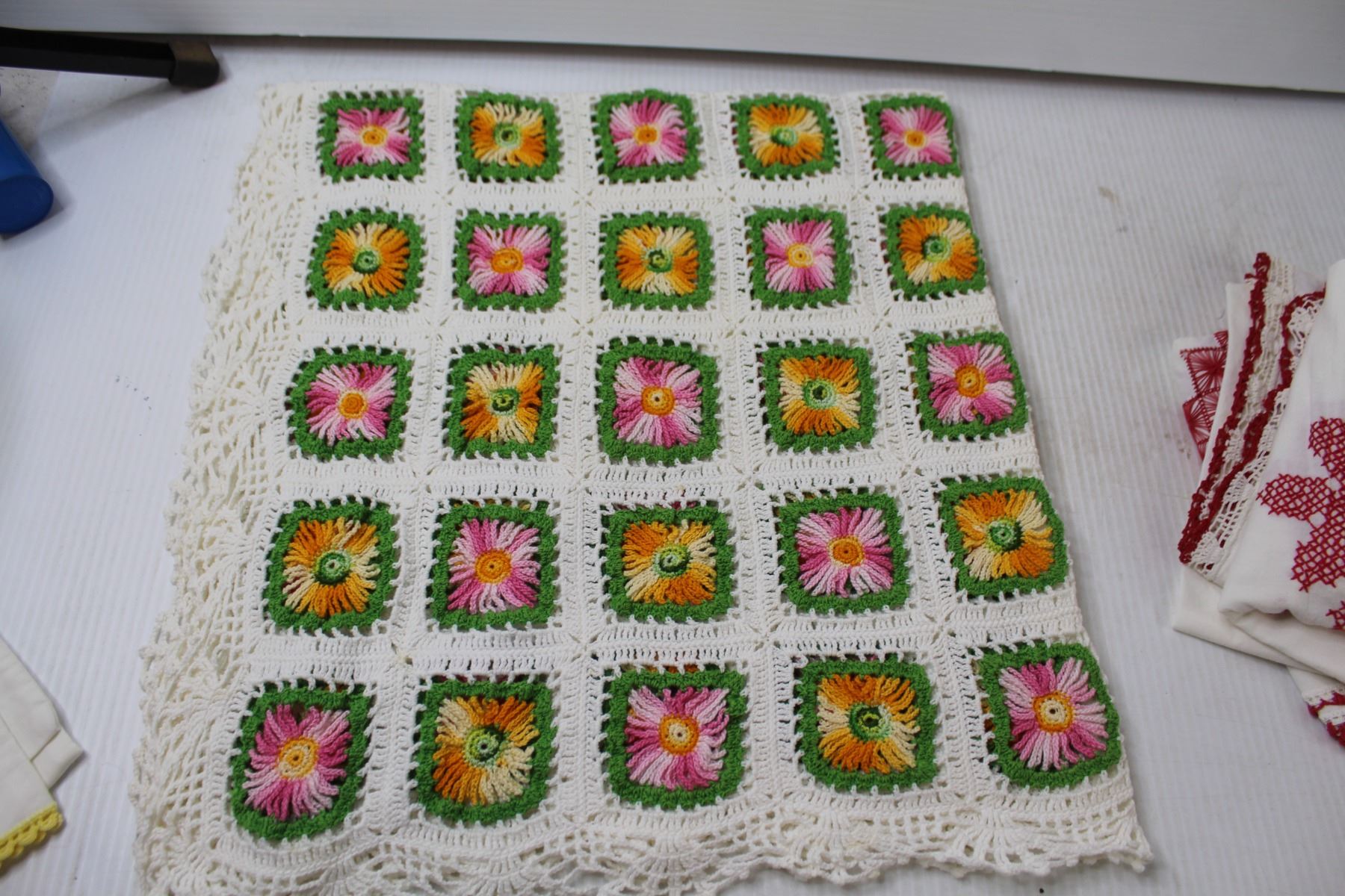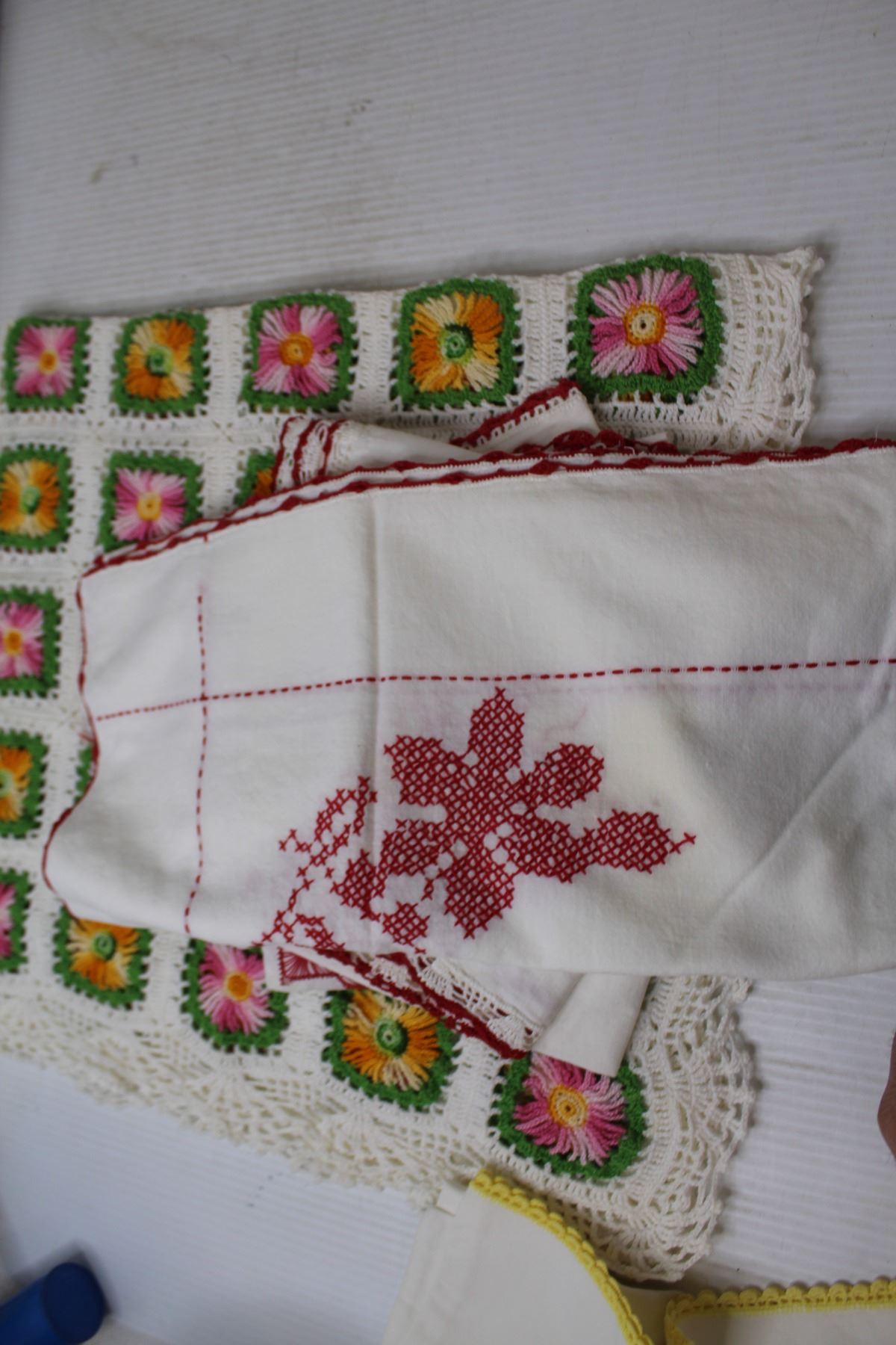 Crochet Table Cloth (app 36x36"), (3) Red (app40x40) stitched Table clothes Red/White), (2) multi-colour stitched ,(1) pillow case 11*18")
