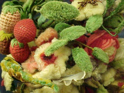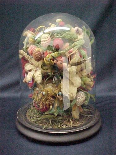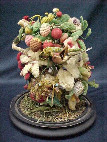 Crocheted thread yarn and chenille floral arrangement with cloth bird and bird's nest with miniature eggs; under glass dome on wooden base; measures 13" high x 10" diameter; early 20th C. (slight loss to wooden base) Estimate 60/120"