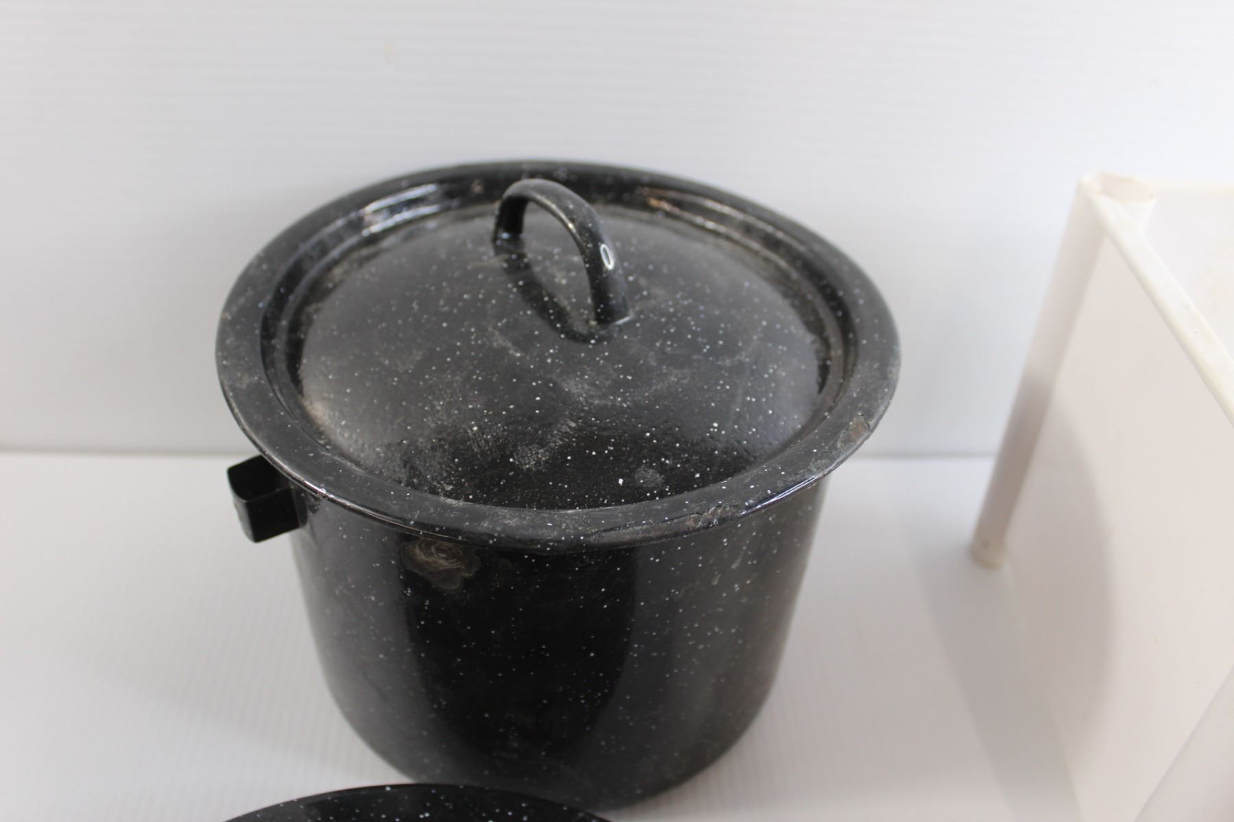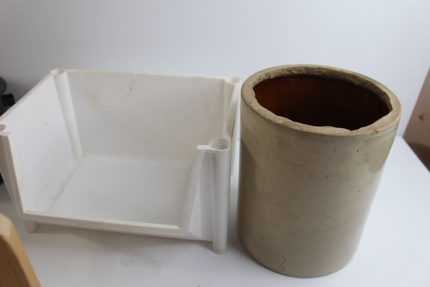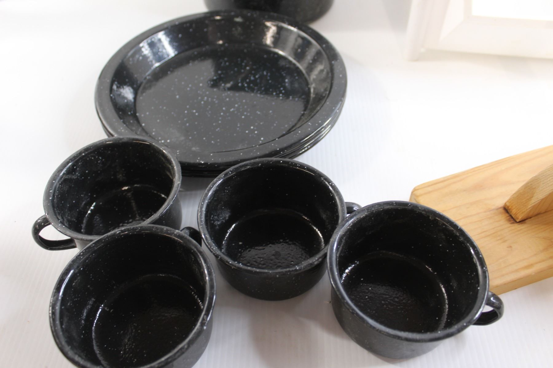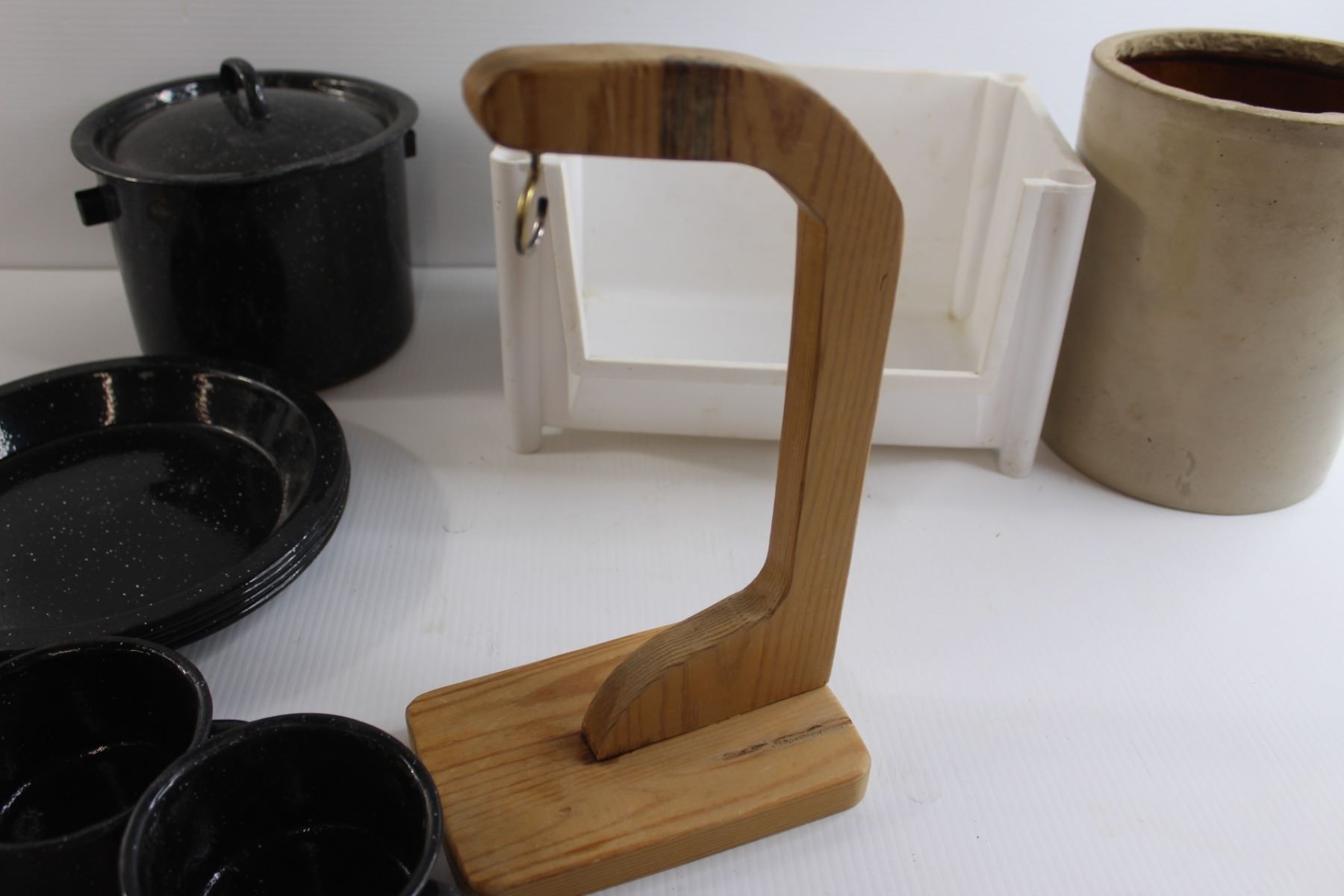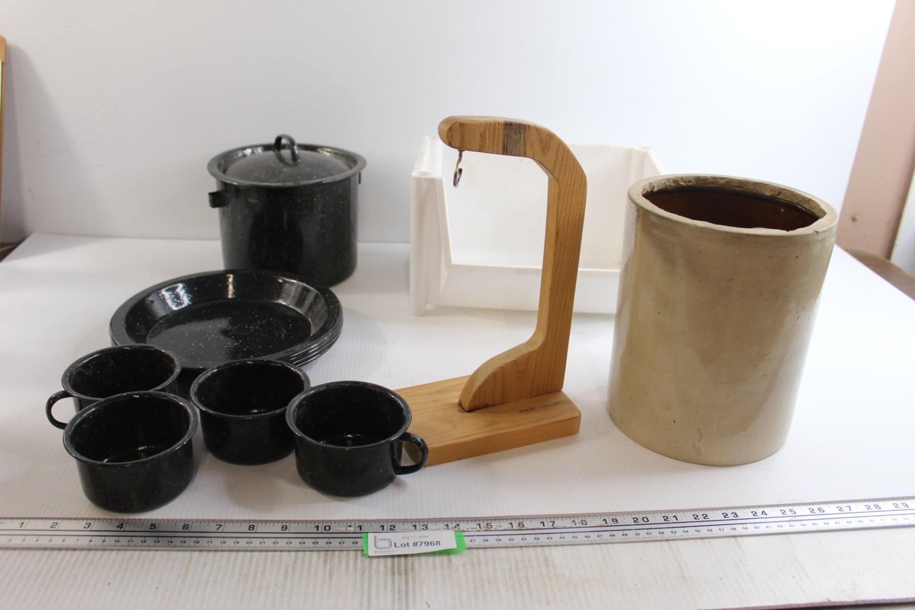 Crock, Banana Hanger, Enamelware Cups and Plates