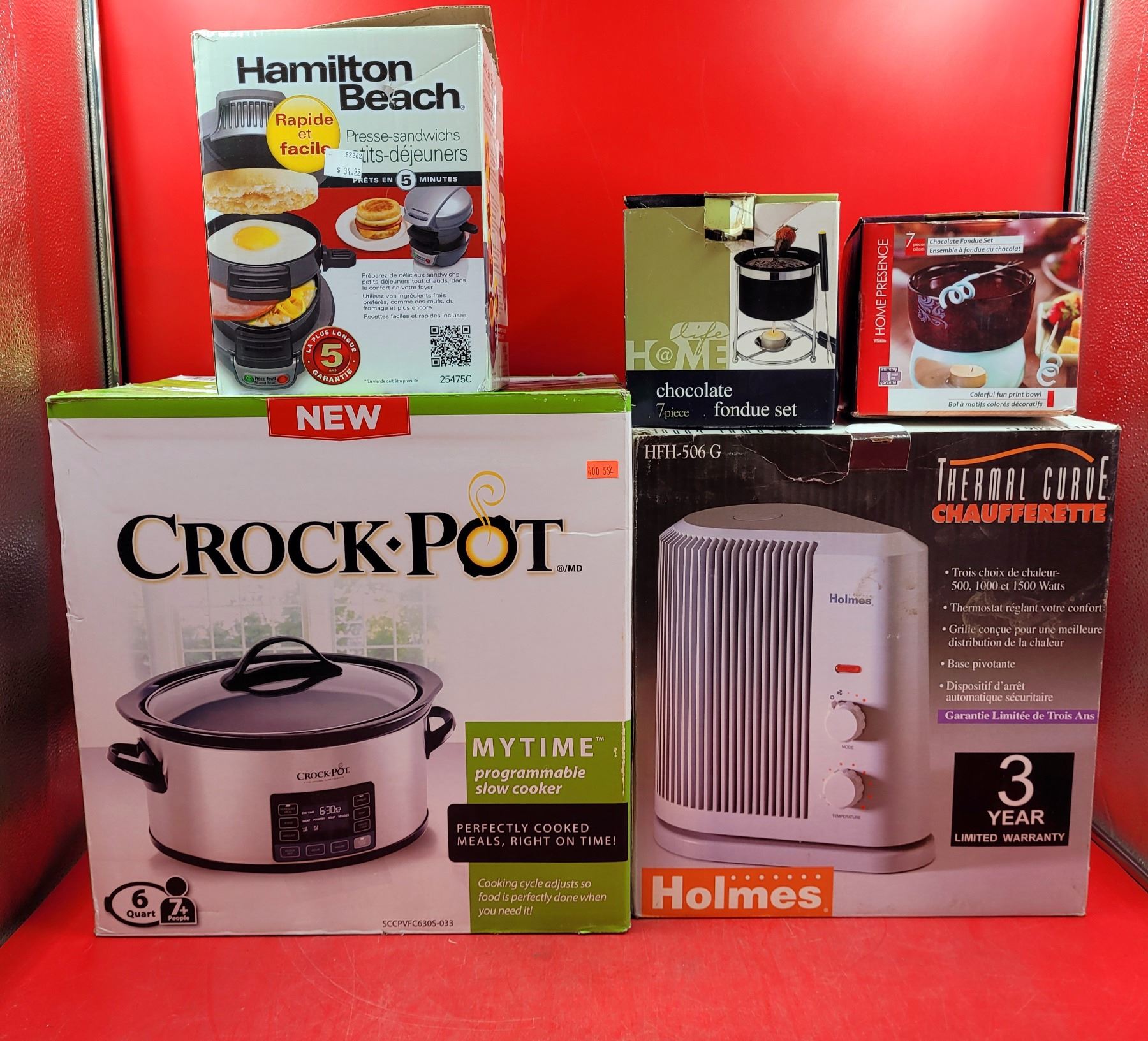Crock Pot Slow Cooker, Holmes Heater, 2 Chocolate Fondue Sets & Hamilton Beach Sandwich Maker