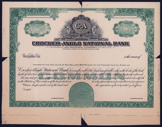 California, 19xx, Stock Proof, Black on green border and underprint on light brown paper, Company logo top center, VF condition with crease down center from folding, SBNC.
