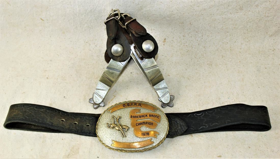 Bronc rider Frank Hunter owned Paddy Ryan pattern #239 stainless spurs with La Junta style silver overlay, and Amarillo, TX marked straps. Along with 1976 Bareback Champion buckle and tooled belt.