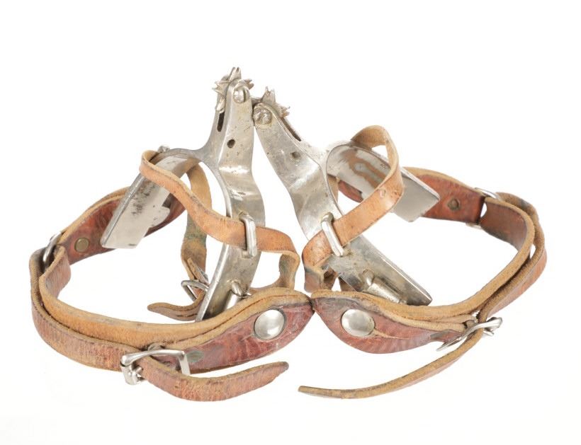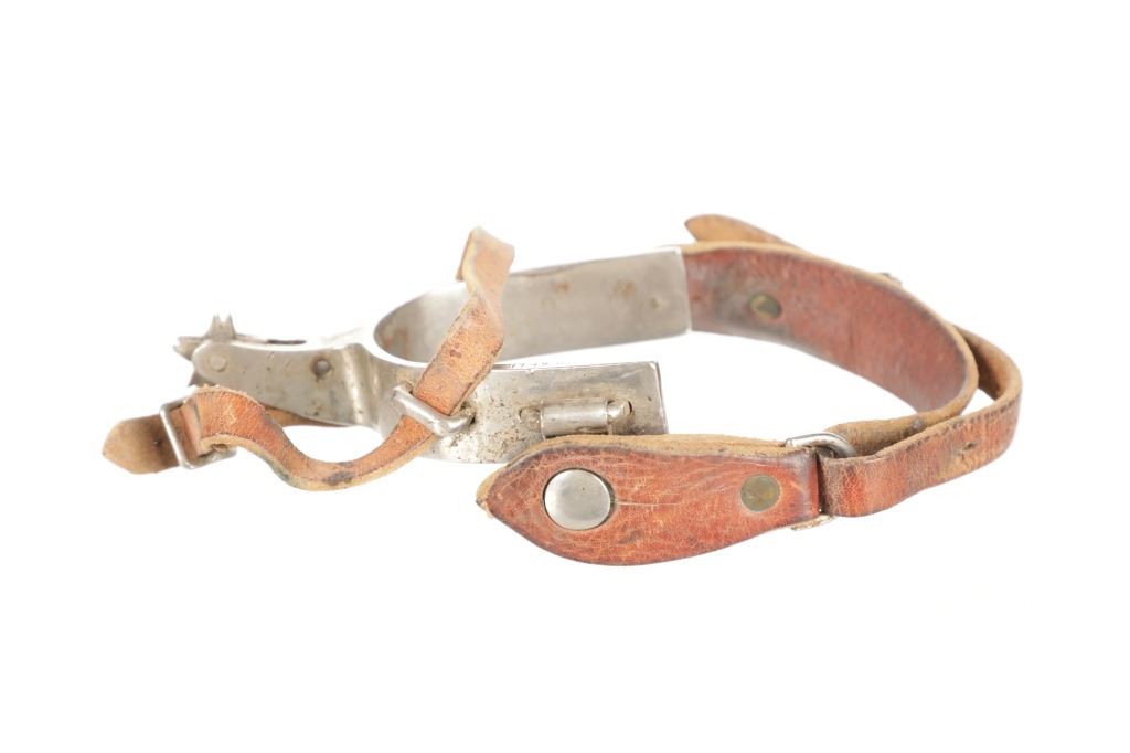 Featured in this lot is this Crockett bull spur rowell cowboy spurs circa 1930's. The spurs show a wonderfully and professionally crafted stainless steel construction that shows a bull rider rowell with a five star design that shows two tines per star point. The leather spur straps are in great shape and shows a heel strap on each spur. The condition of this pair of spurs is good with no obvious signs of damage and shows good overall condition. The measurements of this pair of spurs is 7 1/2" x 4 1/2" x 3". The collective weight of this pair of spurs is 1lb 8oz.