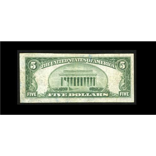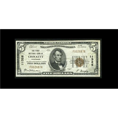 <B>Crockett, CA</B></I> - $5 1929 Ty. 1 <B>The First NB</B></I> Ch. # 11326<BR>A <B>Very Fine+</B></I> example from the only bank to issue in this small Contra Costa County locale. The census still includes a mere four notes of this denomination and type from this northern California community. Tonight's offering enjoys bright color and considerable original crispness and paper body suggesting some claims to an even higher grade.