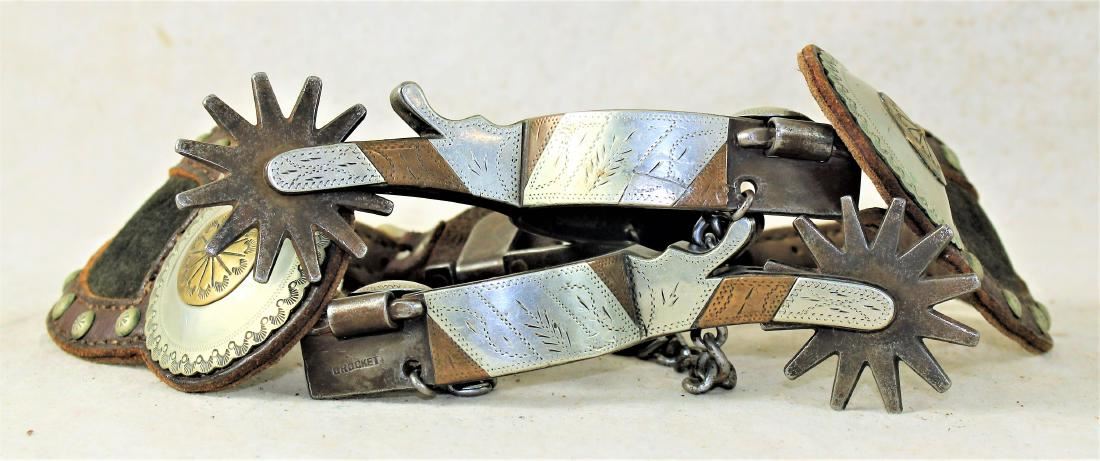 Scarce single mounted two tone spurs with scalloped chap gaurds, large multi-point rowels, and terrific silver mounted straps.