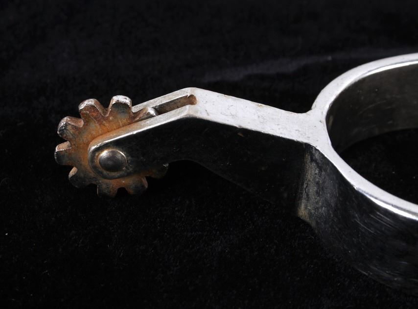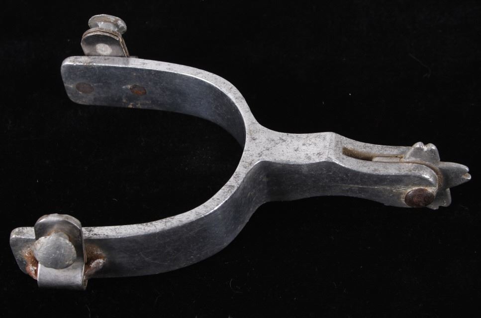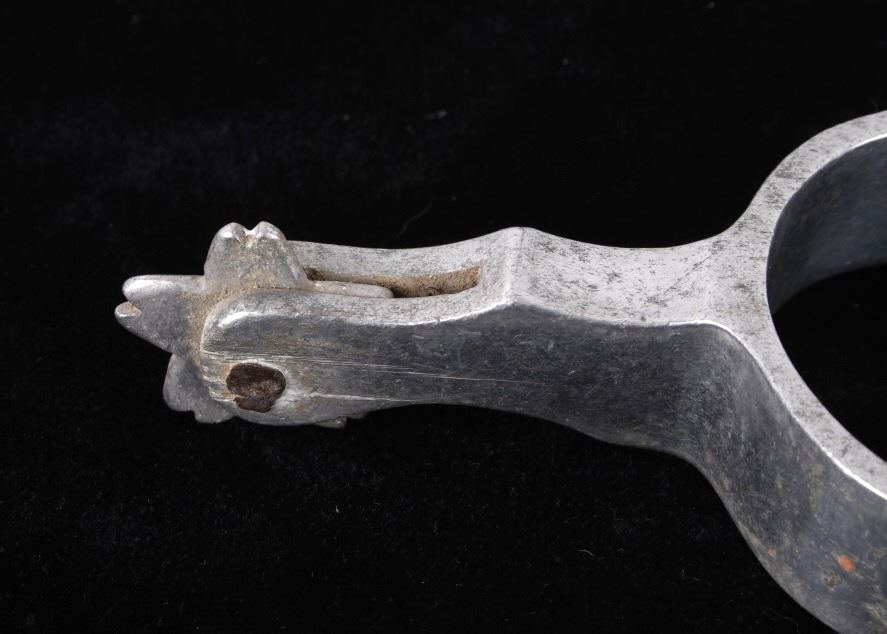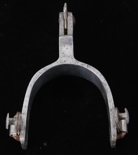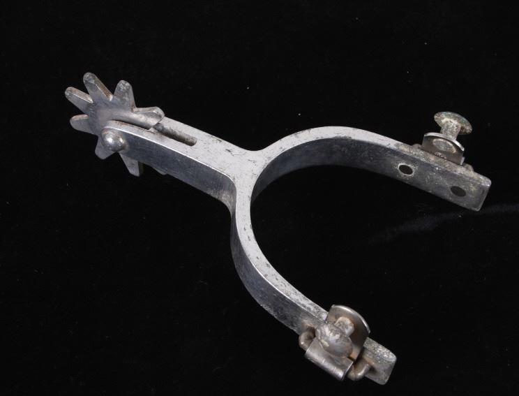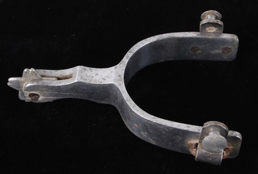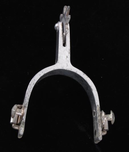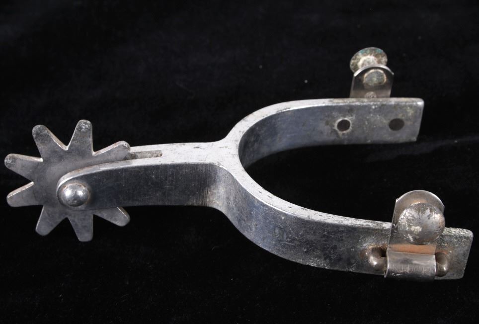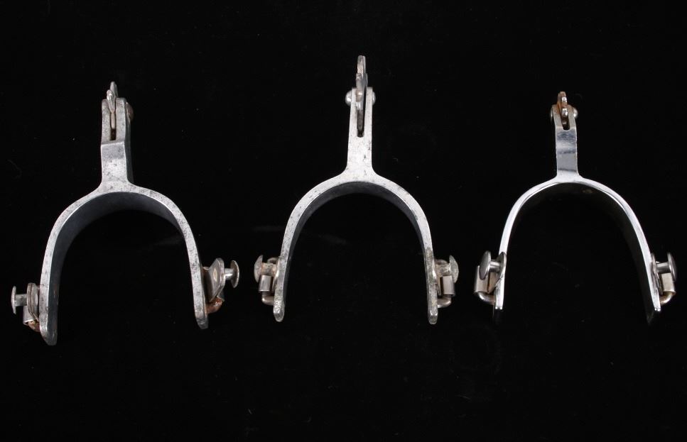 Featured in this lot is this collection of single spurs from Crockett and Crockett Renalde. There are three spurs in this collection. The first is a shop-made Crocket single spur marked with the maker’s mark on the spur frame, by the shank; the spur has a unique double crown five-star rowel with swivel spur strap buttons and a semi straight shank. The next is a heavy rasp-made Crockett Renalde steel spur with a crook shank with ten round tine spur rowels; the spur can be identified by the maker’s mark on the swivel spur strap button. The last spur is a Crockett Renalde single spur, identified by the maker’s mark on the underside of the swivel spur strap button, with a straight shank and a nine round star rowel. The condition of these single spurs is good, with slight oxidation and wear consistent with the age of the spurs. The measurements of these spurs are 1 1/2" x 4" x 5 1/2", 1 1/2" x 4 1/2" x 6", and 2" x 4 1/4" x 6 1/8".