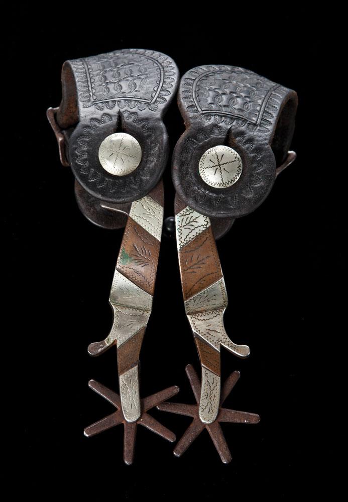 Texas spur No. 252 with maker-mark under buttons. Tapered bands mounted with golden bronze and silver. Chains missing, shows in catalog that these were available with and without chains. 2 3/8” spoke rowels, large overlaid strap buttons. Slight oxidation on rowels, piece of silver missing on chap guard but overall excellent condition.