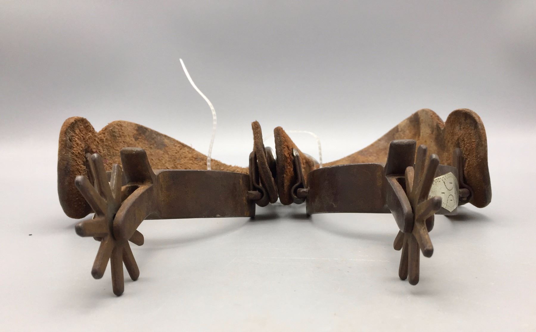 Description: Crockett diamond pattern spurs with straps. Maker: Hallmarked, Crockett under the swing buttons. Approx. Age: Circa 1925 - 35. Size: Heel opening is 3 1/4“. Heel bands are 1“ wide. Shanks are 3 1/4“ long including the rowels. Condition: Good for their age, normal wear expected. Please look closely at the pictures - they are an important part of our description. Shipping: There will be a $5 handling / packaging fee for shipping this lot. The actual cost of postage will be added on top of that.