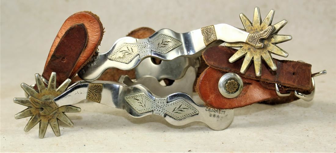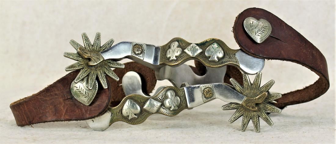 Very scarce oversized double mounted spurs with elongated legs, two tone mountings, three dimensionial scalloped card suit heelbands and large engraved rowels.
