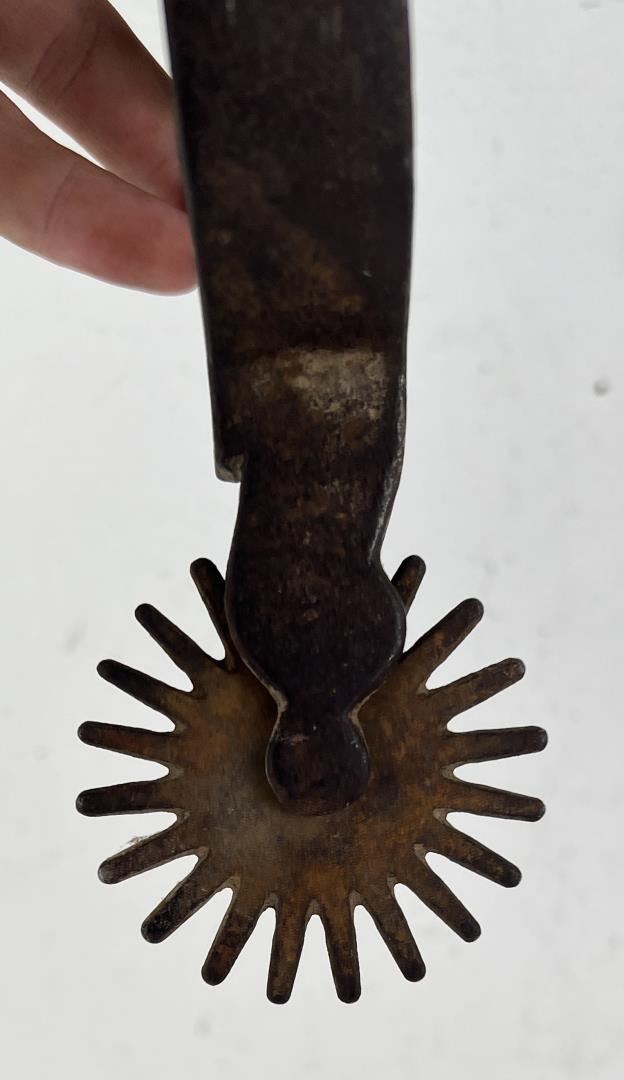 Hard to find pattern in original unaltered patina. Marked Crockett on the outside near the button on both spurs.