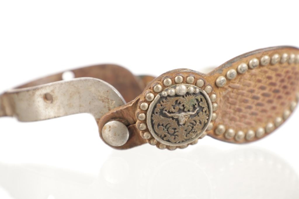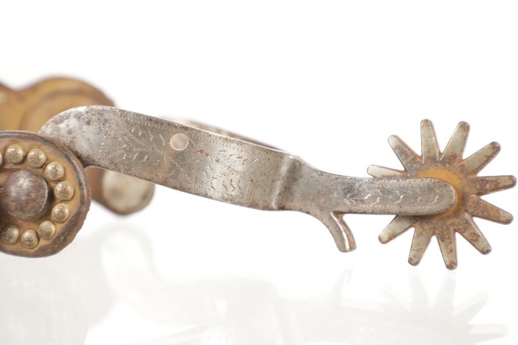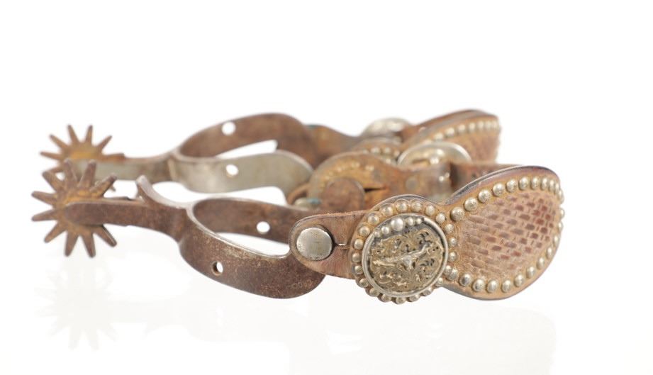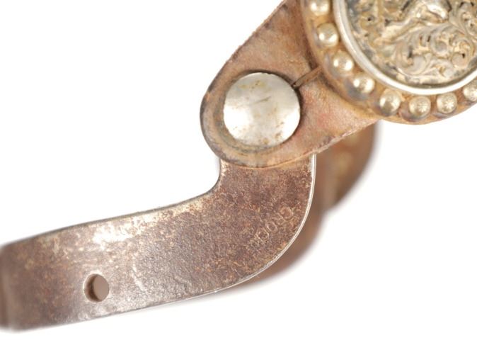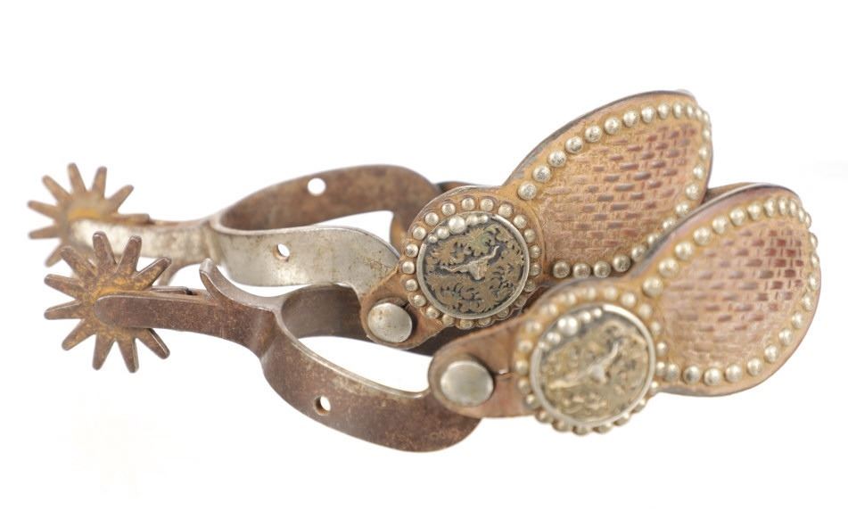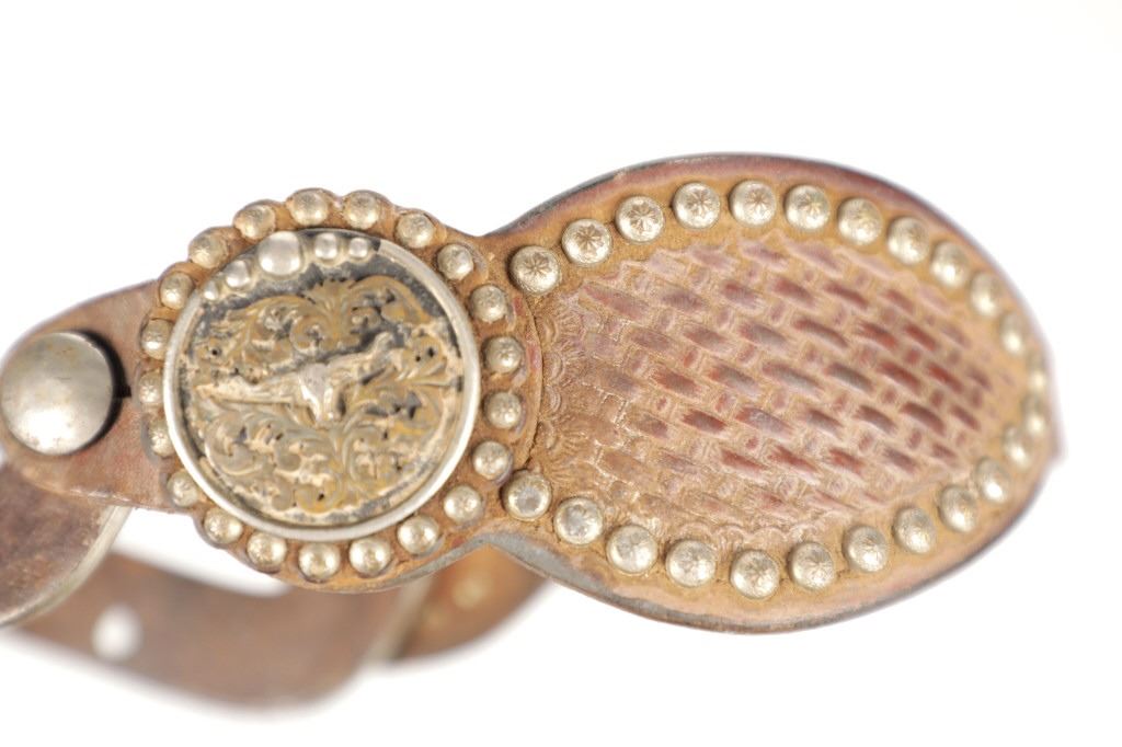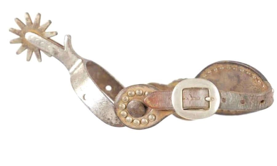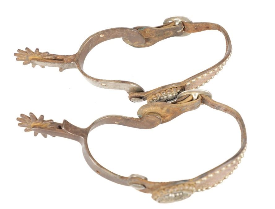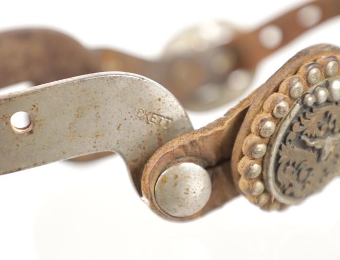Featured in this lot is this Crockett nickel silver mounted cowboy spurs circa 1940's. The spurs features a wonderfully and professionally crafted construction that shows a 12 rowel that shows a chap guard and shows a nickel silver mounted decoration with floral design and shows a studded spur strap per spur. The spurs are stamped 'CROCKETT'. The condition of this pair of spurs shows some oxidation to the frame of the spurs and a slight patina to the nickel mounting due to the age of the spurs. The measurements of this pair of spurs8 3/4" x 5" x 2". The collective weight of these spurs is 1lb 8oz.