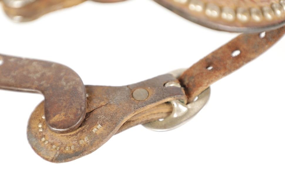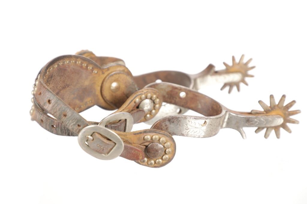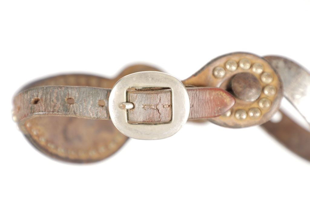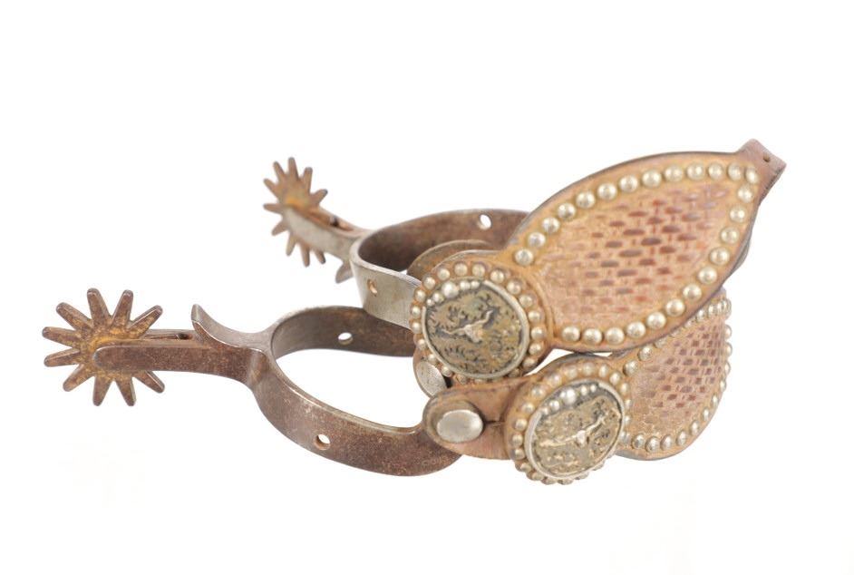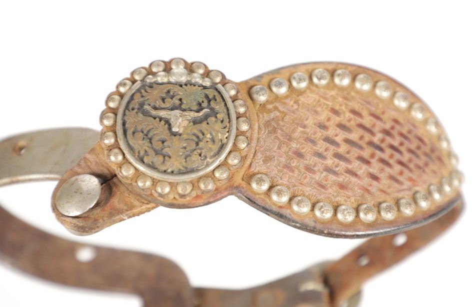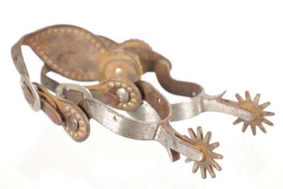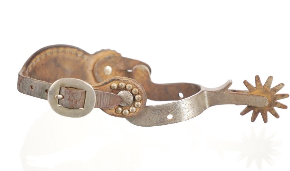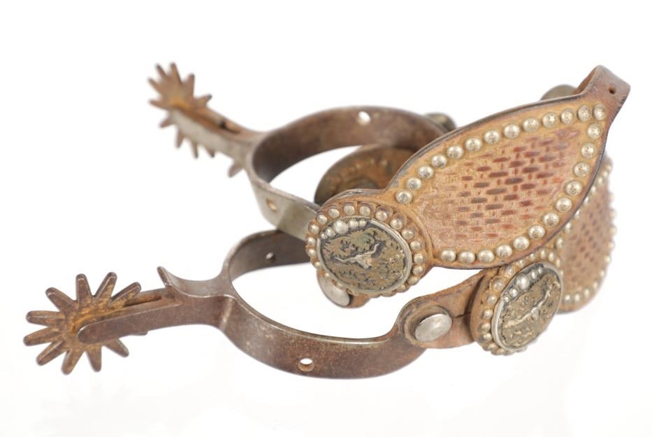 Featured in this lot is this Crockett nickel silver mounted cowboy spurs circa 1940's. The spurs features a wonderfully and professionally crafted construction that shows a 12 rowel that shows a chap guard and shows a nickel silver mounted decoration with floral design and shows a studded spur strap per spur. The spurs are stamped 'CROCKETT'. The condition of this pair of spurs shows some oxidation to the frame of the spurs and a slight patina to the nickel mounting due to the age of the spurs. The measurements of this pair of spurs8 3/4" x 5" x 2". The collective weight of these spurs is 1lb 8oz.