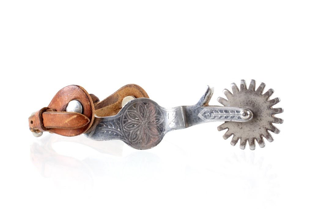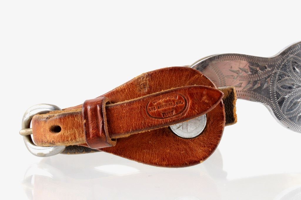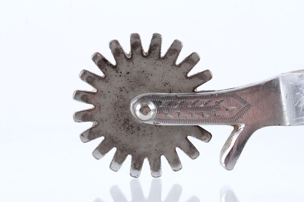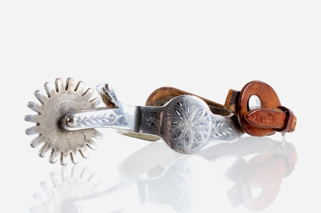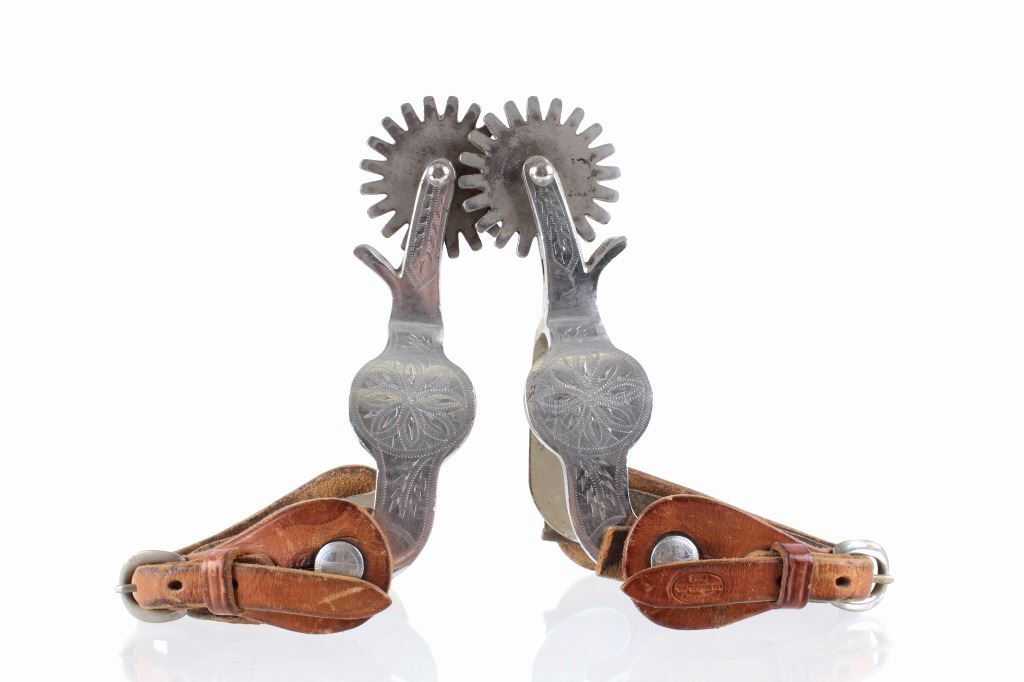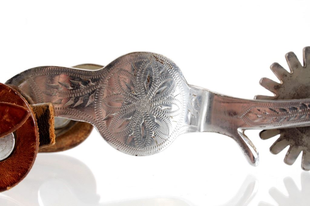 For your consideration is this pair of silver mounted large star rowel parade spurs shown from spur maker Crockett & Ranalde. These spurs are marked with the CR within a horseshoe at the heel of the band indicating Crockett & Renalde. The tooled silver mountings show floral design on each outer side of the spurs. Each spur has a double leather strap with buckle, and one strap shows an oval stamp reading "Champion Turp, Los Angeles, Cal.". These fine pair of spurs show in good condition for their age and use, with a nice patina to the metal, and rugged leather straps. The measurements of each spur is 9.25" from the spur strap to the rowel tip; and the overall measurements of each spur are approximately 6.5" x 3.5" x 9.25" with a 2.5" rowel.